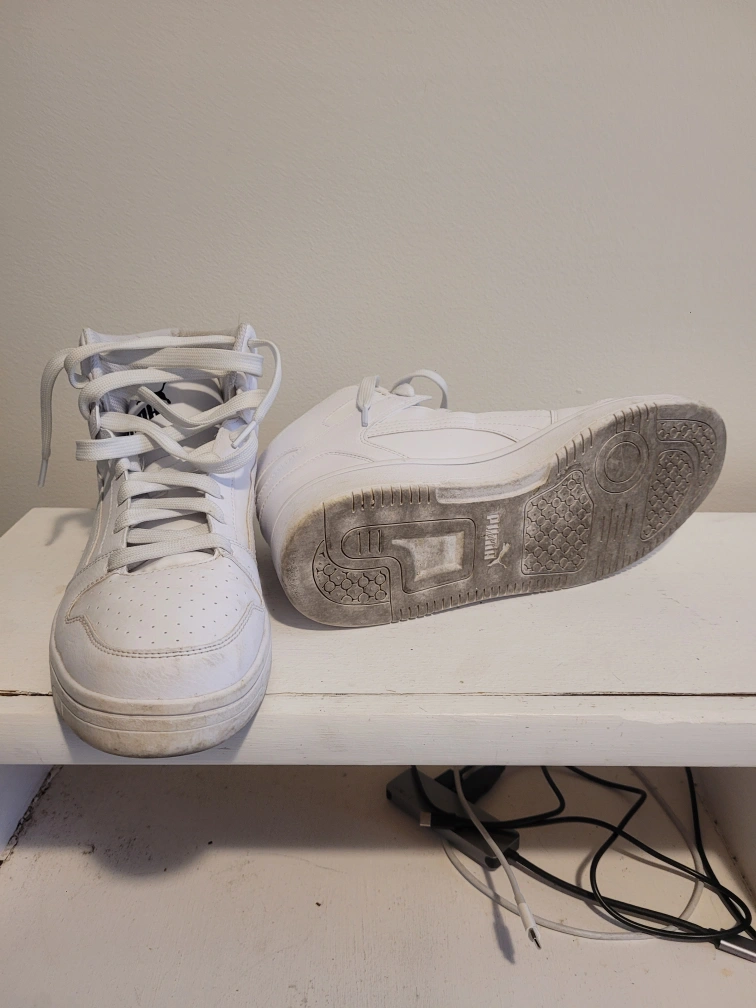 Selling a pair of Puma Rebound Joy high-top sneakers in white. They're in good condition and ready for a new home! These sneakers are stylish and comfortable, perfect for everyday wear. Warning, these shoes fit very slim. not great if you have wide/large feet