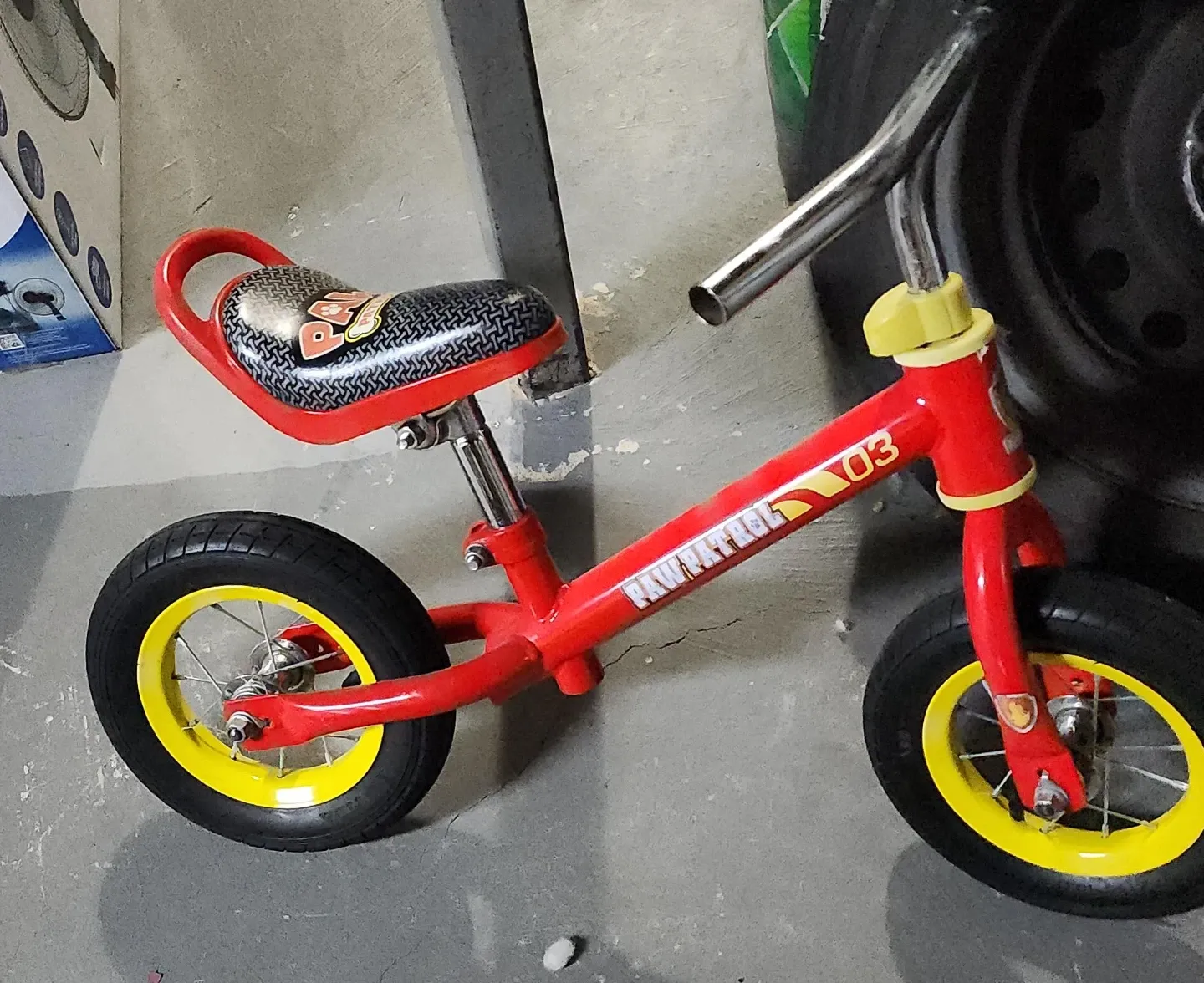 This red Paw Patrol balance bike is perfect for little ones learning to balance. It features the Paw Patrol logo and the number 03. This bike has a metal frame and rubber tires.