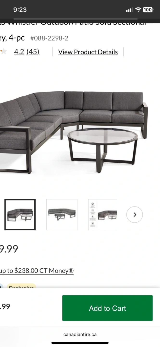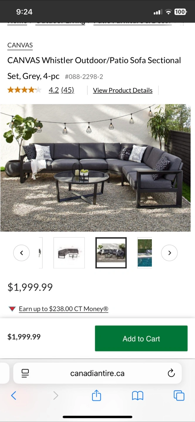 Selling a CANVAS Whistler outdoor sectional set in grey. It's a 4-piece set, perfect for your patio or deck! Retails for $1999.99.