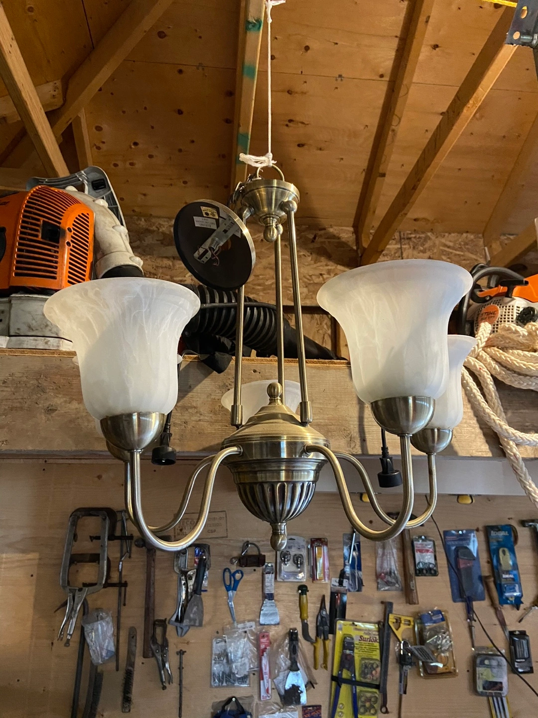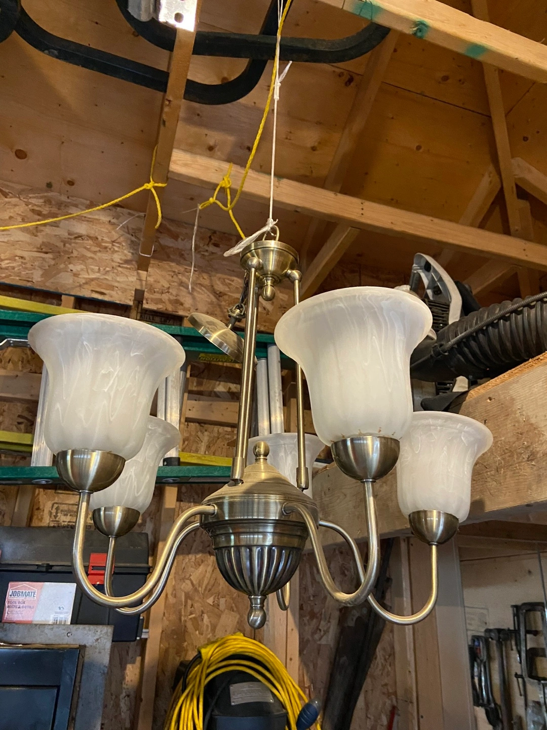 Selling a chandelier lighting fixture! It features a classic design with frosted glass shades and a metal frame. It would be a great addition to any dining room, living room, or entryway. It's in good condition and ready to brighten up your home