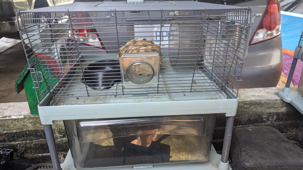 Selling a used hamster cage that comes with various accessories. It includes a water bottle, food dish, and some toys for your furry friend. Perfect for a small hamster or other small pet. It's in good condition and ready for a new home! the one with more stuff 40.00