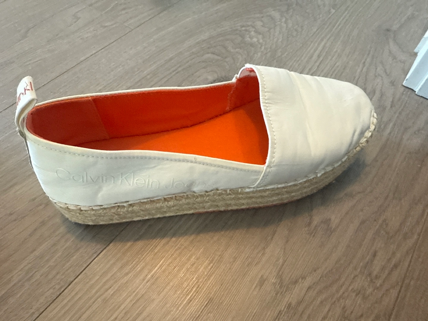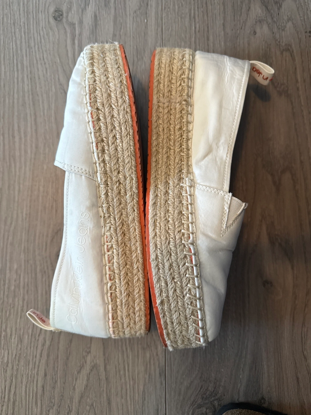 These are a pair of Calvin Klein espadrille flats in a size 8.5