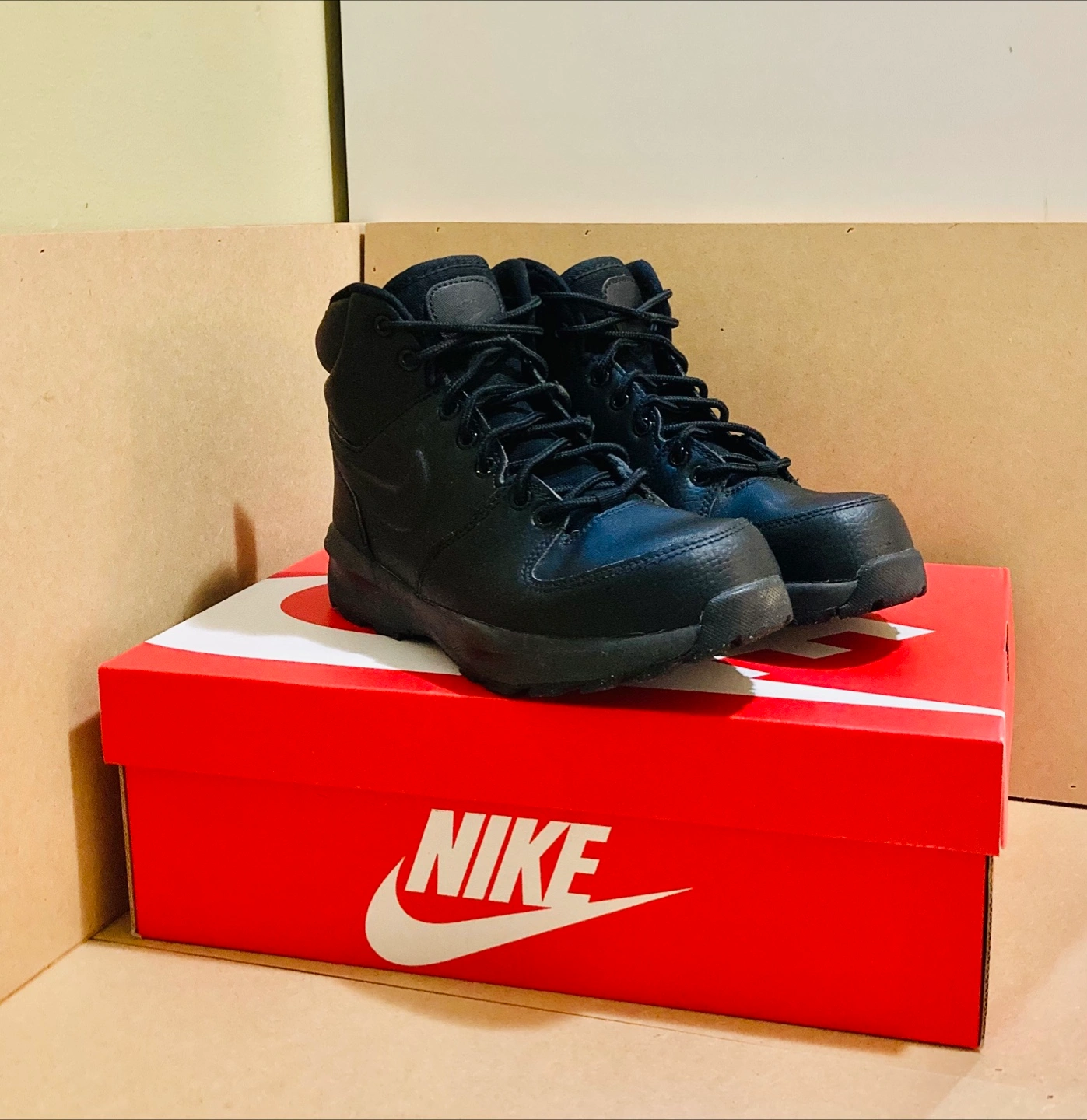 Selling a pair of Nike Manoa Leather boots in black. These boots are in great shape and come with the original box! Only worn 3 times. Size Youth 6Y. Super high quality materials and performance. Waterproof. Great for Winter, Fall, and the Spring time. Keeps your feet warm.