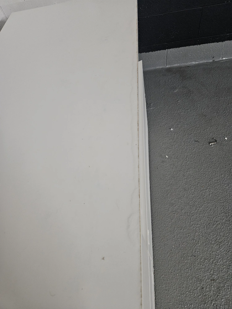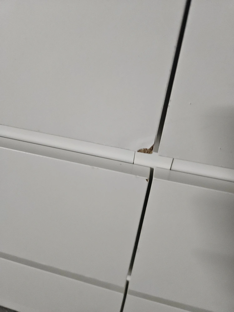 Has some water damage as shown in the picture. Also a small crack on the corner of one of the drawers.