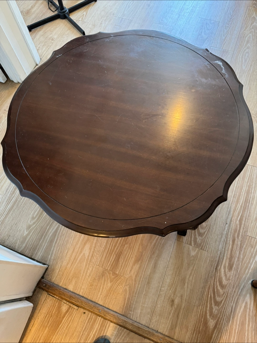 Selling a round coffee table with a dark wood finish. It has a classic design with curved legs and a decorative edge. There are some signs of wear on the top and edges, as shown in the photos, but it's still a sturdy and stylish piece for your living room. But have some scratches on the top