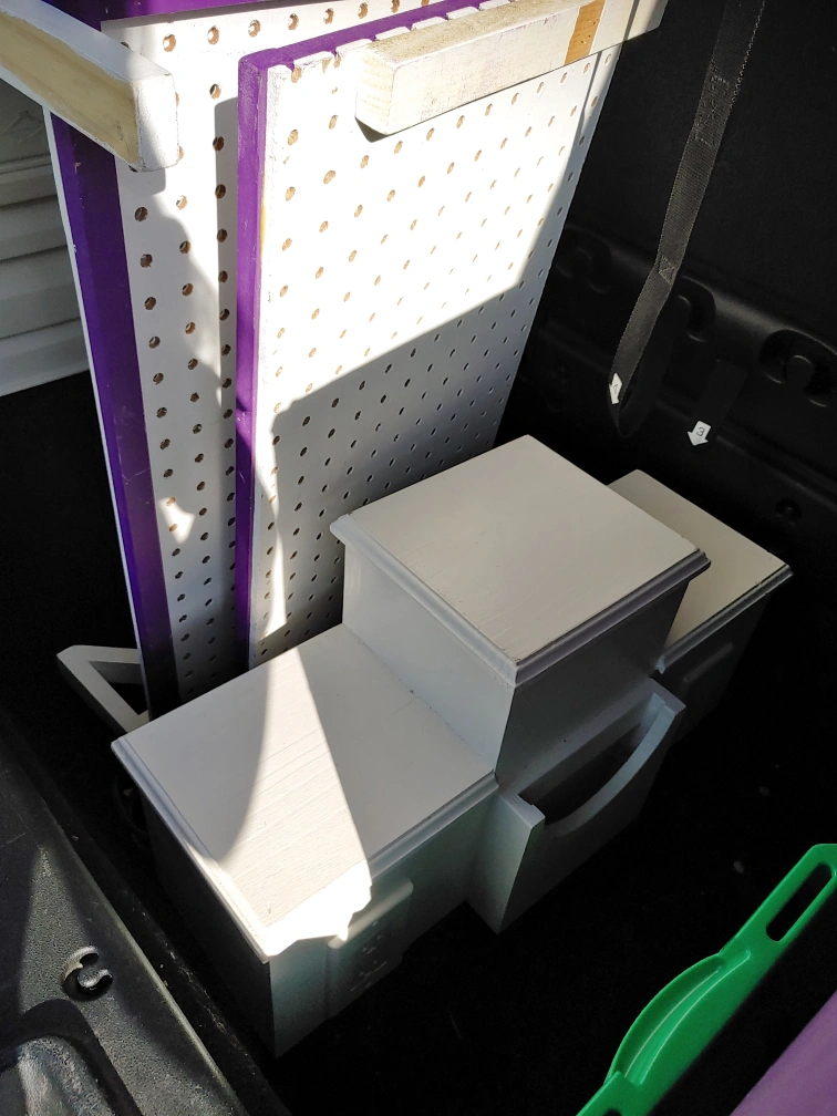 Selling a white wooden display stand, perfect for showcasing items! It features a pegboard and a tiered display with small drawers. Great for craft fairs or retail displays. Scentsy consultant items sample packaging, stickers, totes, cloth.