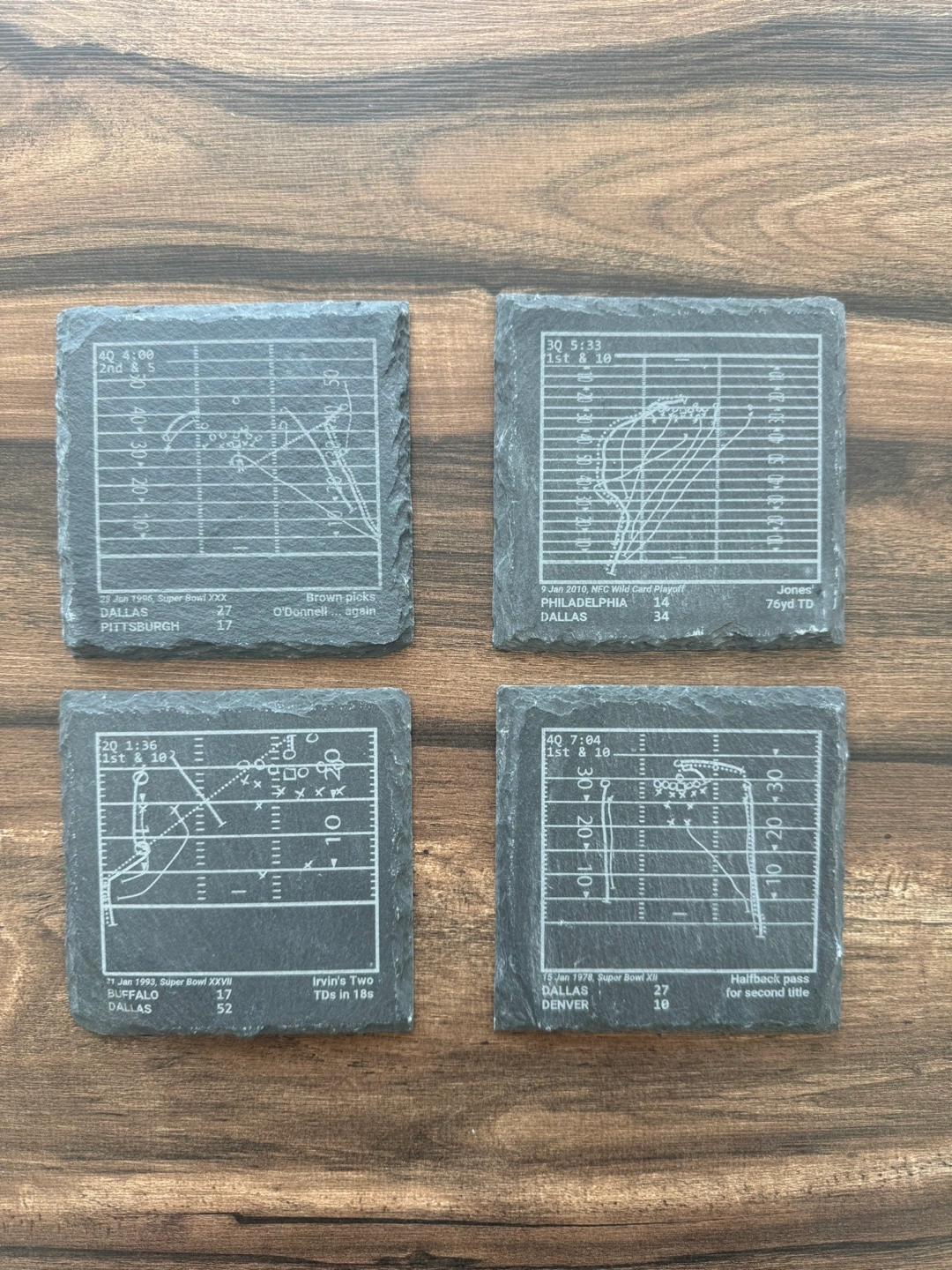 Brand new set of 4 Playbook laser-engraved slate coasters featuring different NFL Super Bowl plays!