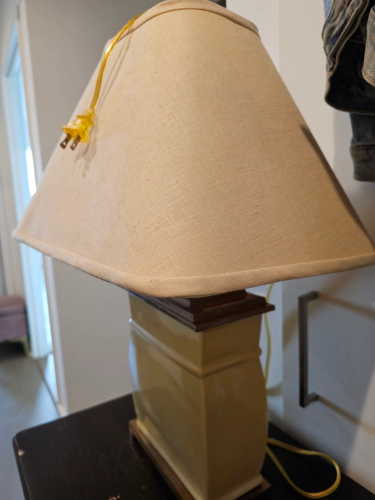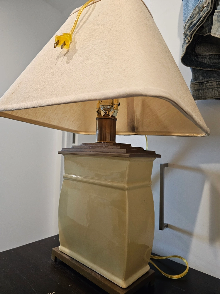 Selling a lovely vintage table lamp! It features a square, beige-colored shade and a complementary ceramic base. It would be a great addition to any room! Lampshade needs spot cleaning.