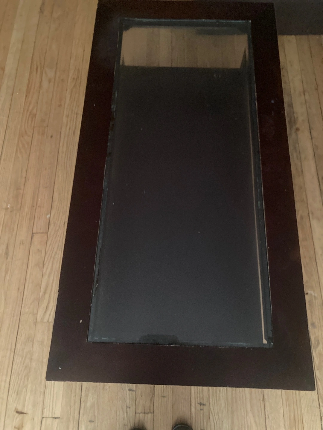 Dark brown coffee table with a glass top and a shelf underneath. It's in good condition and would be a great addition to any living room