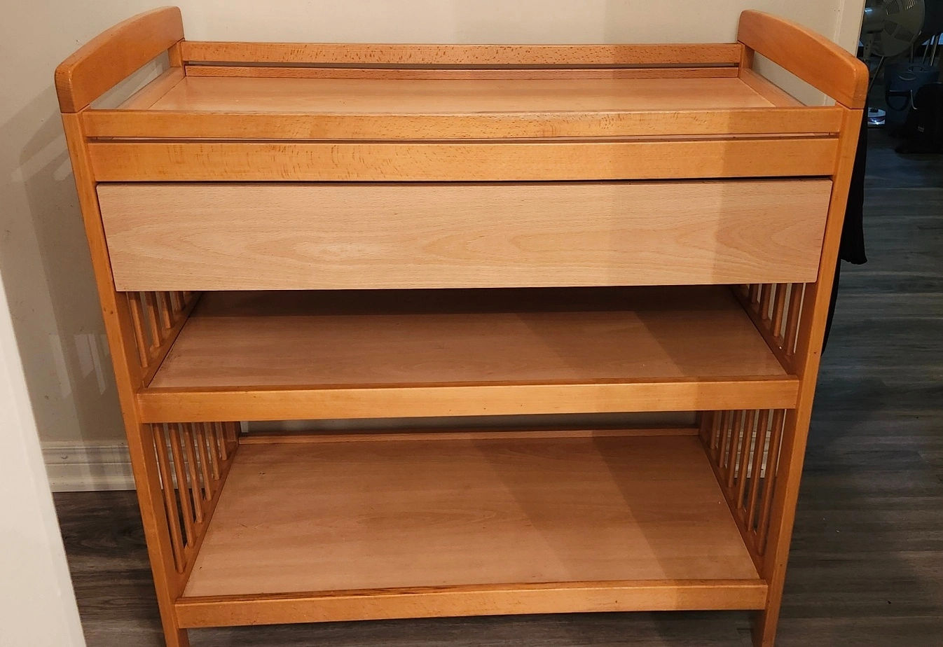 Changing table in good condition. It has a drawer and two shelves for storage