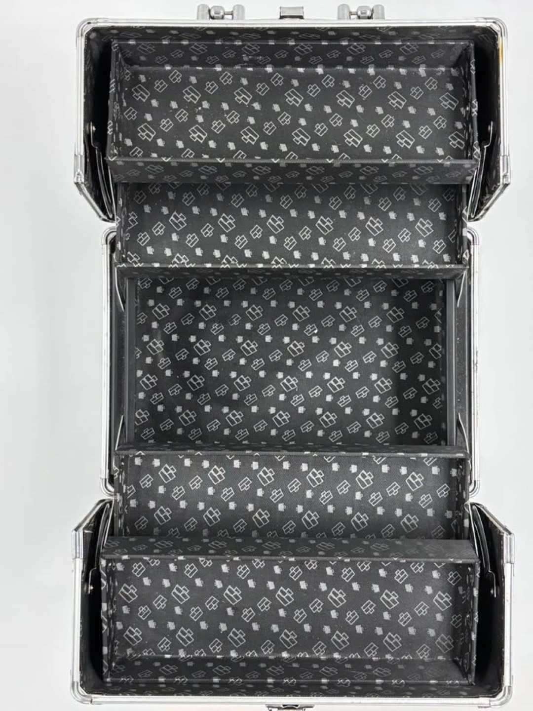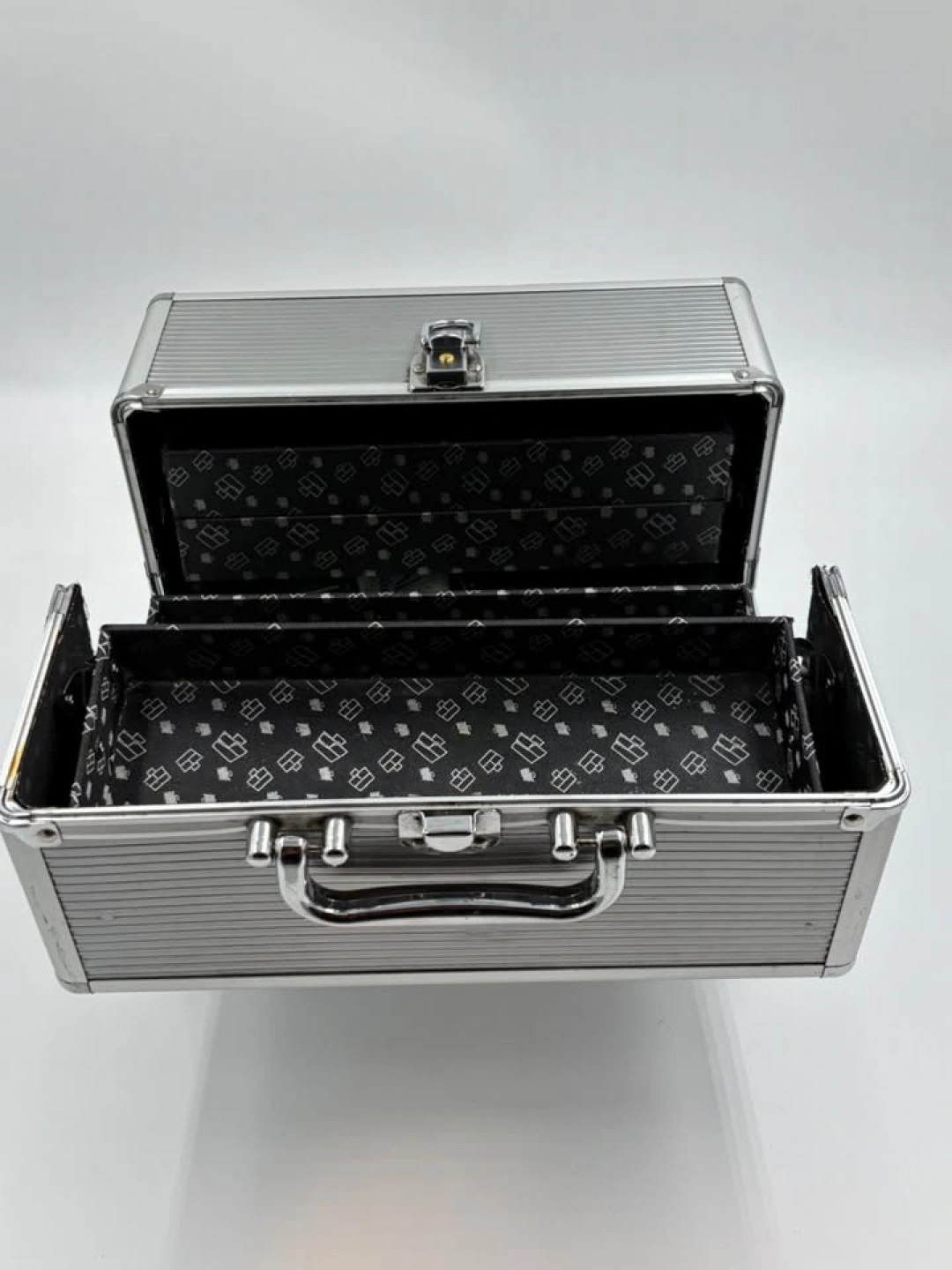 150Here's a silver aluminum makeup/cosmetic organizer case. It's in great condition and ready to store all your beauty essentials! The interior has a cool black and white patterned lining.