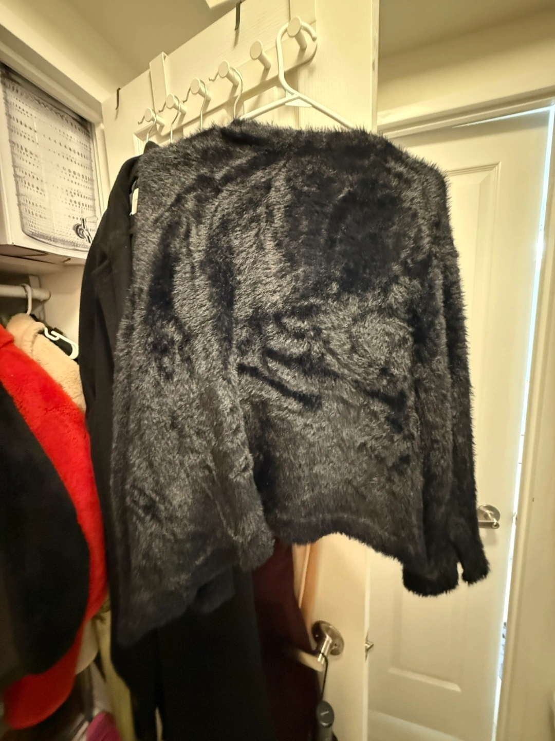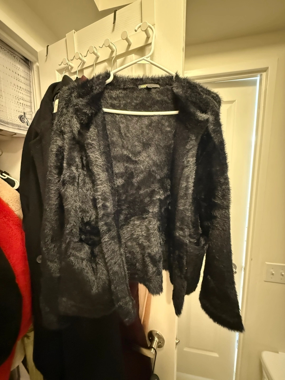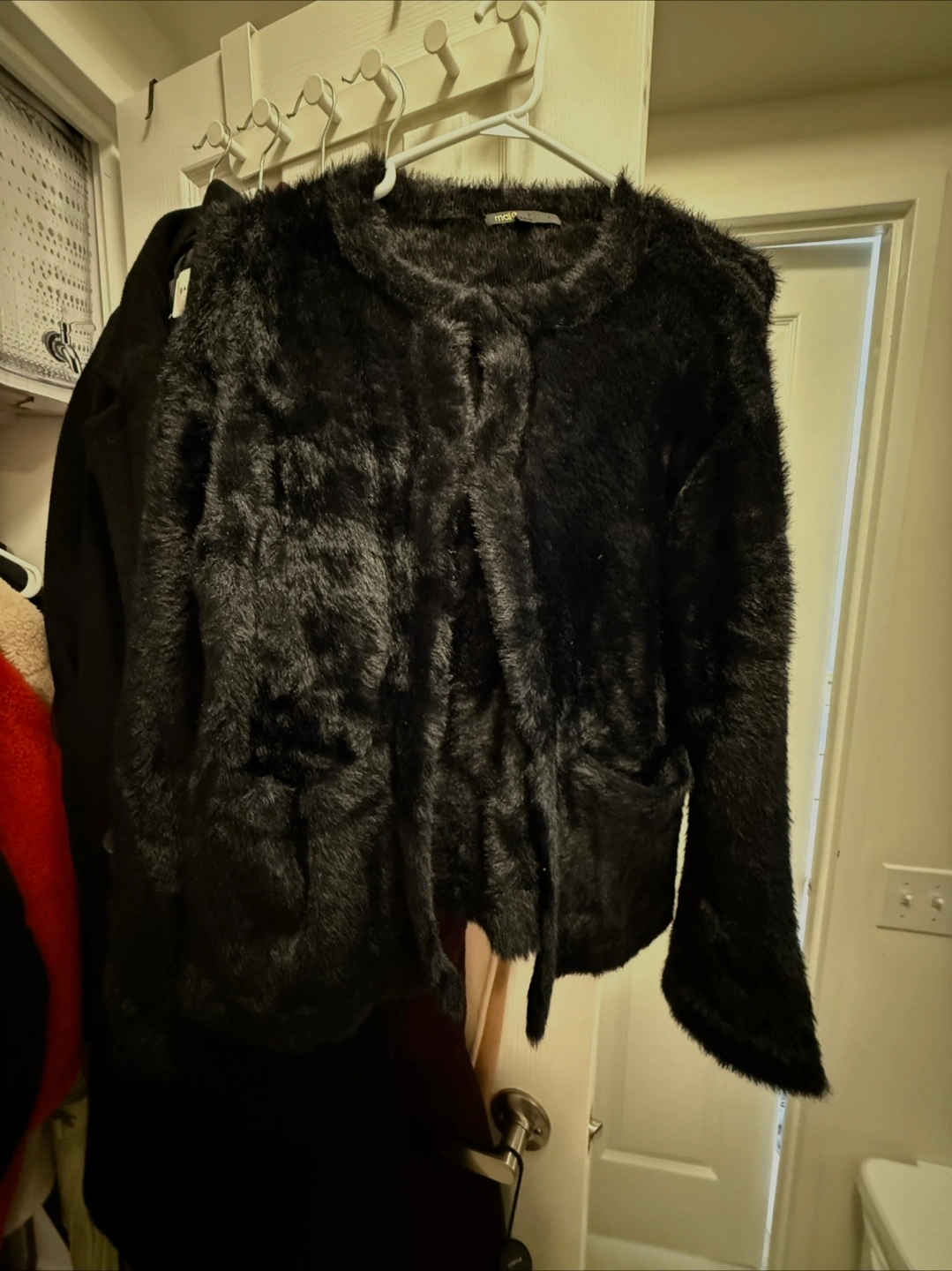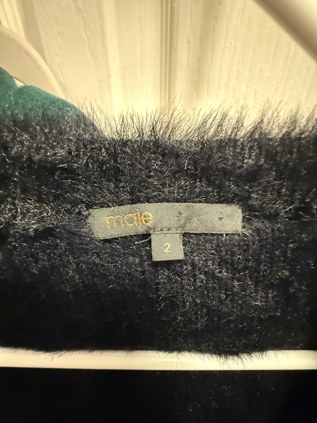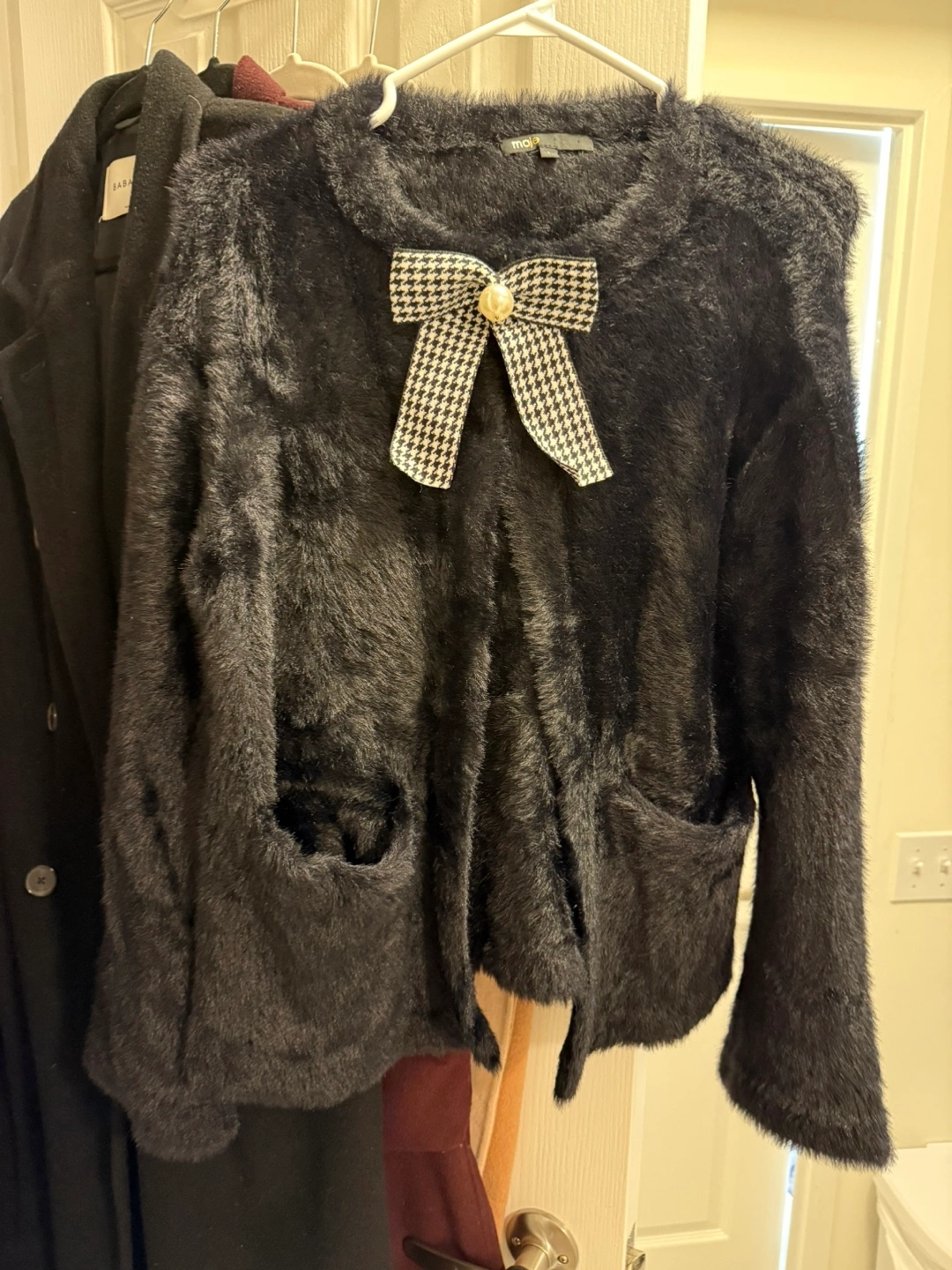 Cute Maje black cardigan, perfect for layering! It has a soft fuzzy texture and a sweet bow detail (removable), making it a stylish addition to any outfit. Very stretchy and warm. Never worn, like new. Original price $550 PICKUP AND CASH ONLY