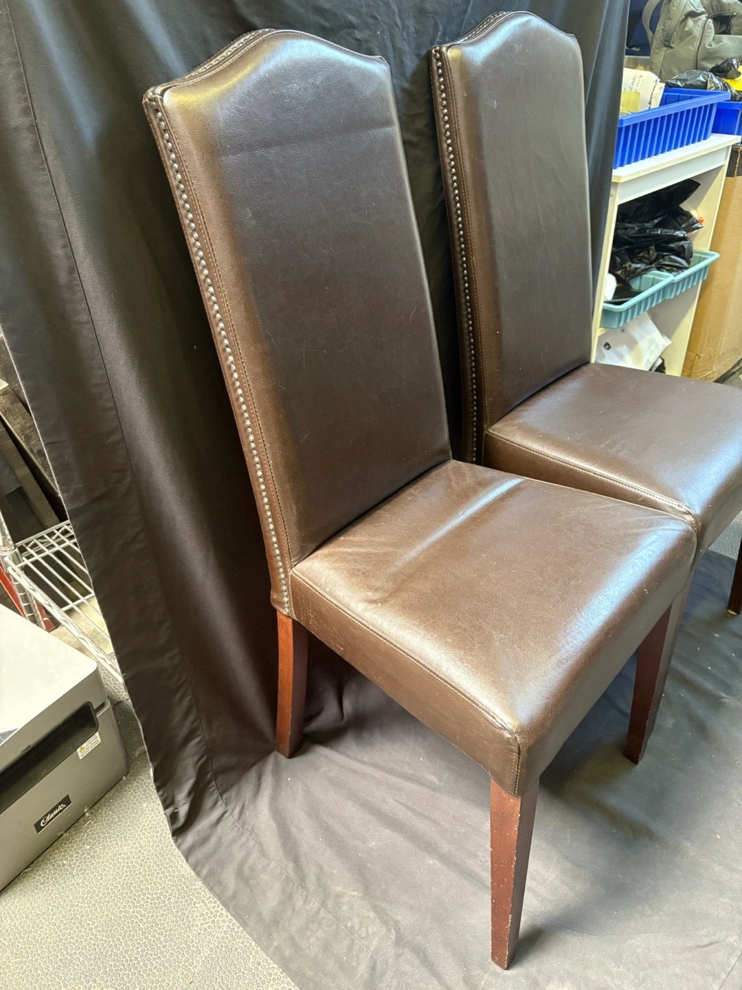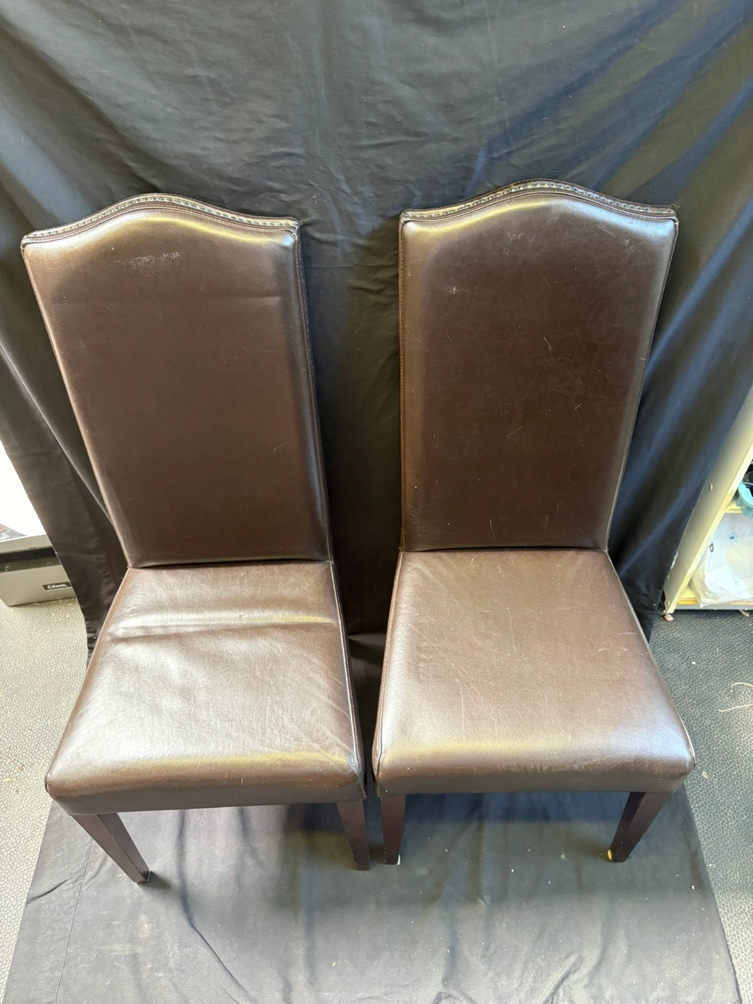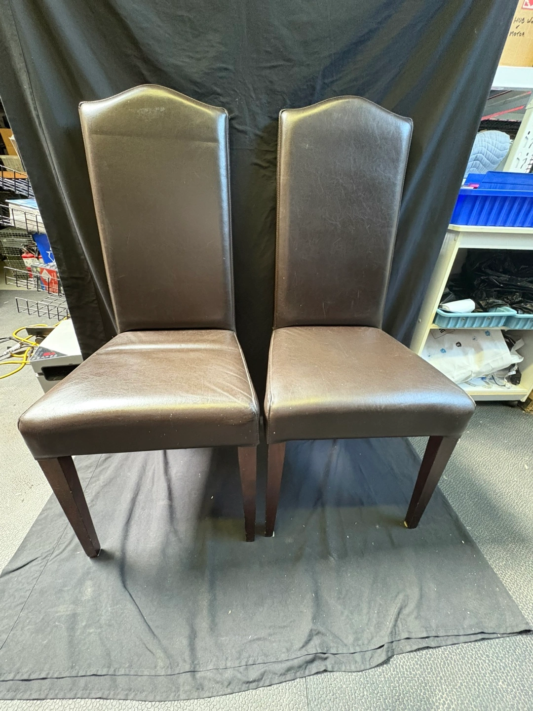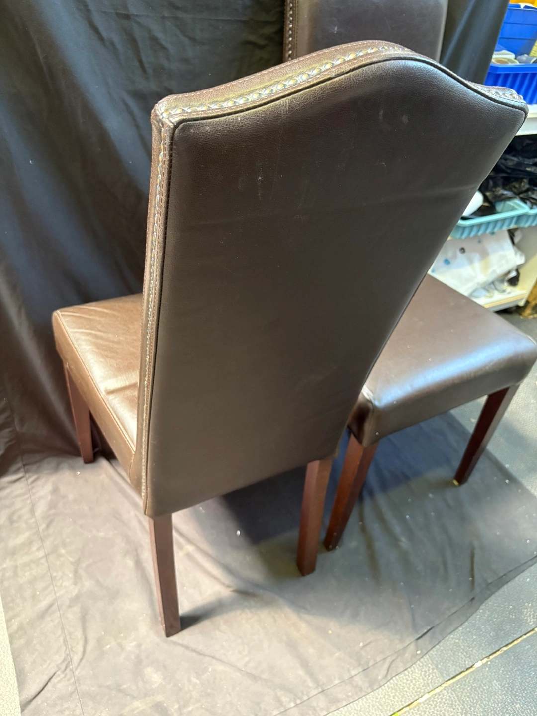 Selling a set of two brown leather dining chairs. They're in good condition and would look great in any dining room or kitchen!