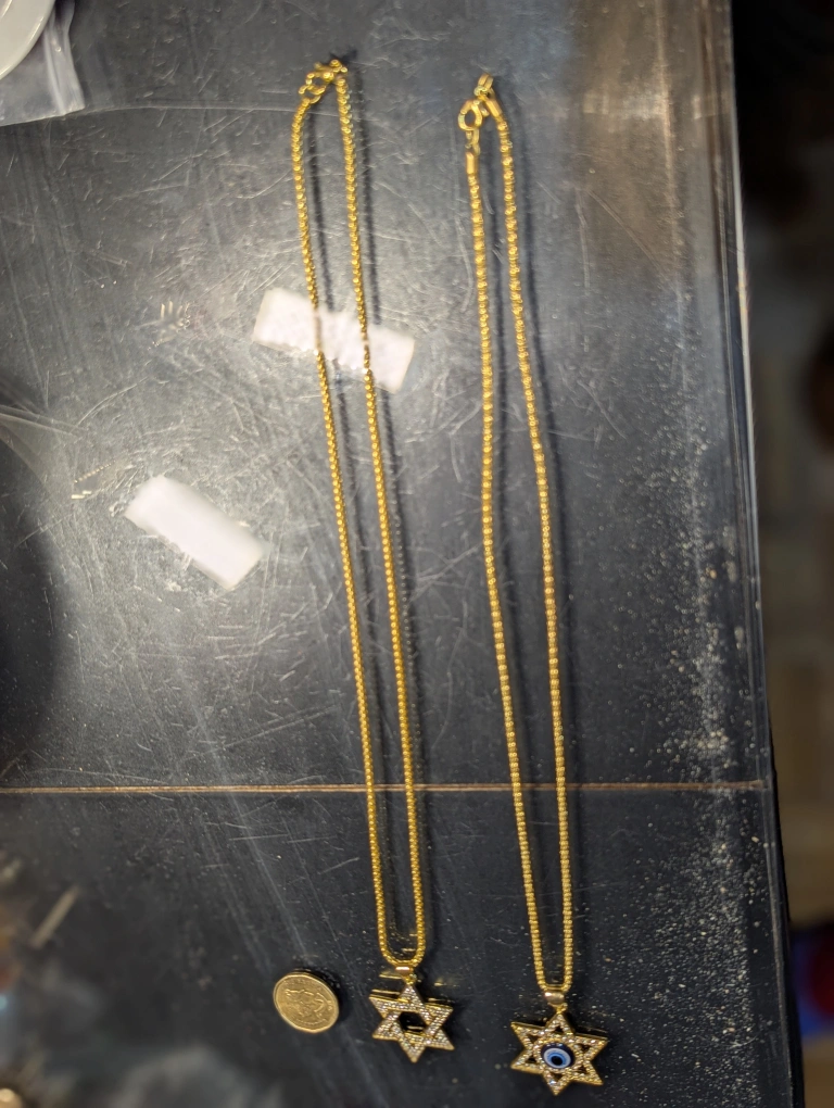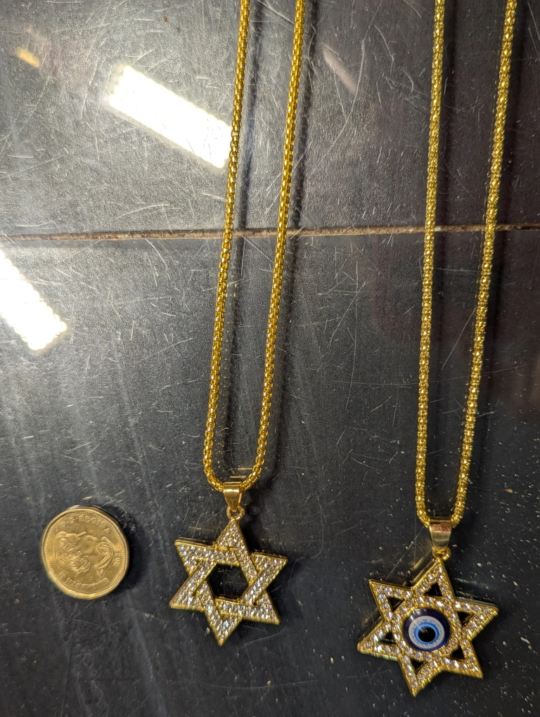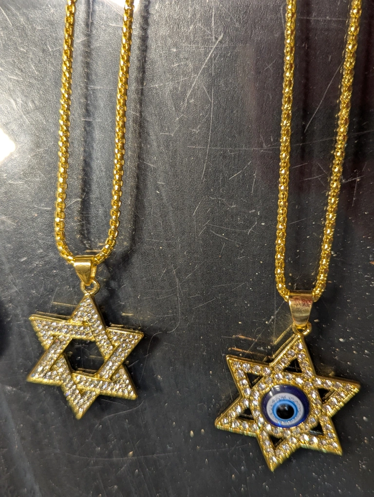 For sale two brand new gold-plated Star of David pendant necklaces.