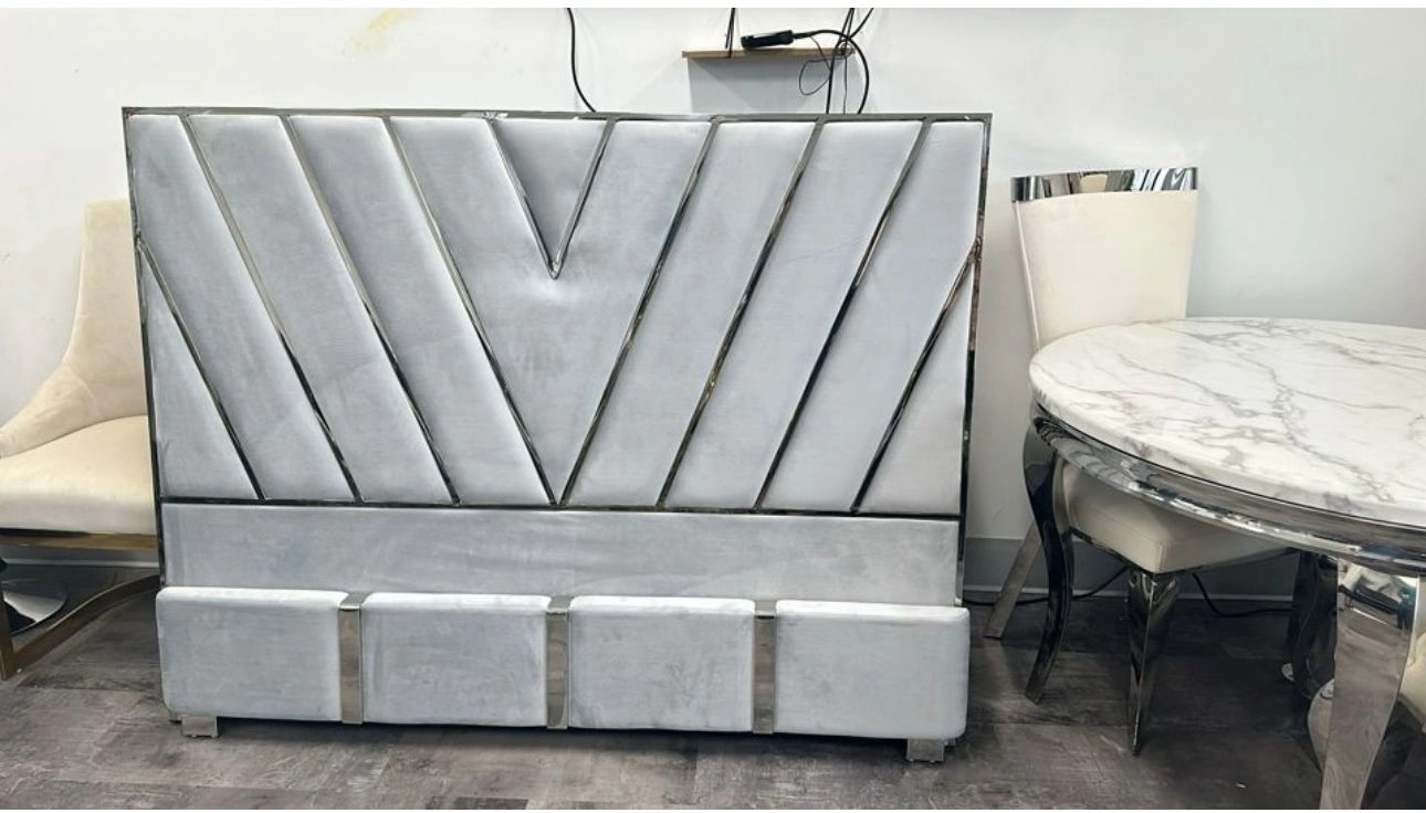 Here's a stylish grey upholstered headboard featuring a modern design with chrome trim. It would make a great addition to any bedroom!