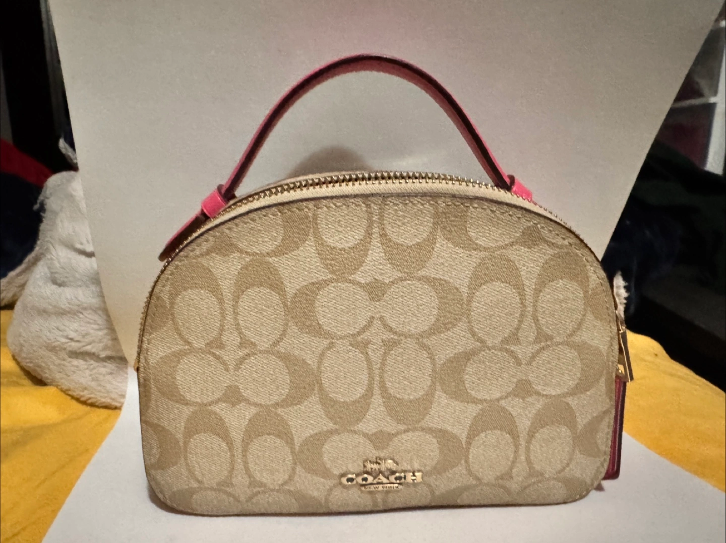 Selling a cute Coach crossbody bag! It features a beige signature print with pink accents on the handles and strap. It's in great condition and perfect for everyday use