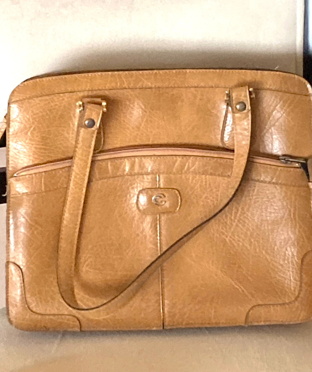 This is a lovely tan leather handbag in good condition. It has a classic design and is perfect for everyday use. It features three zippered compartments and several pockets to keep your belongings organized.