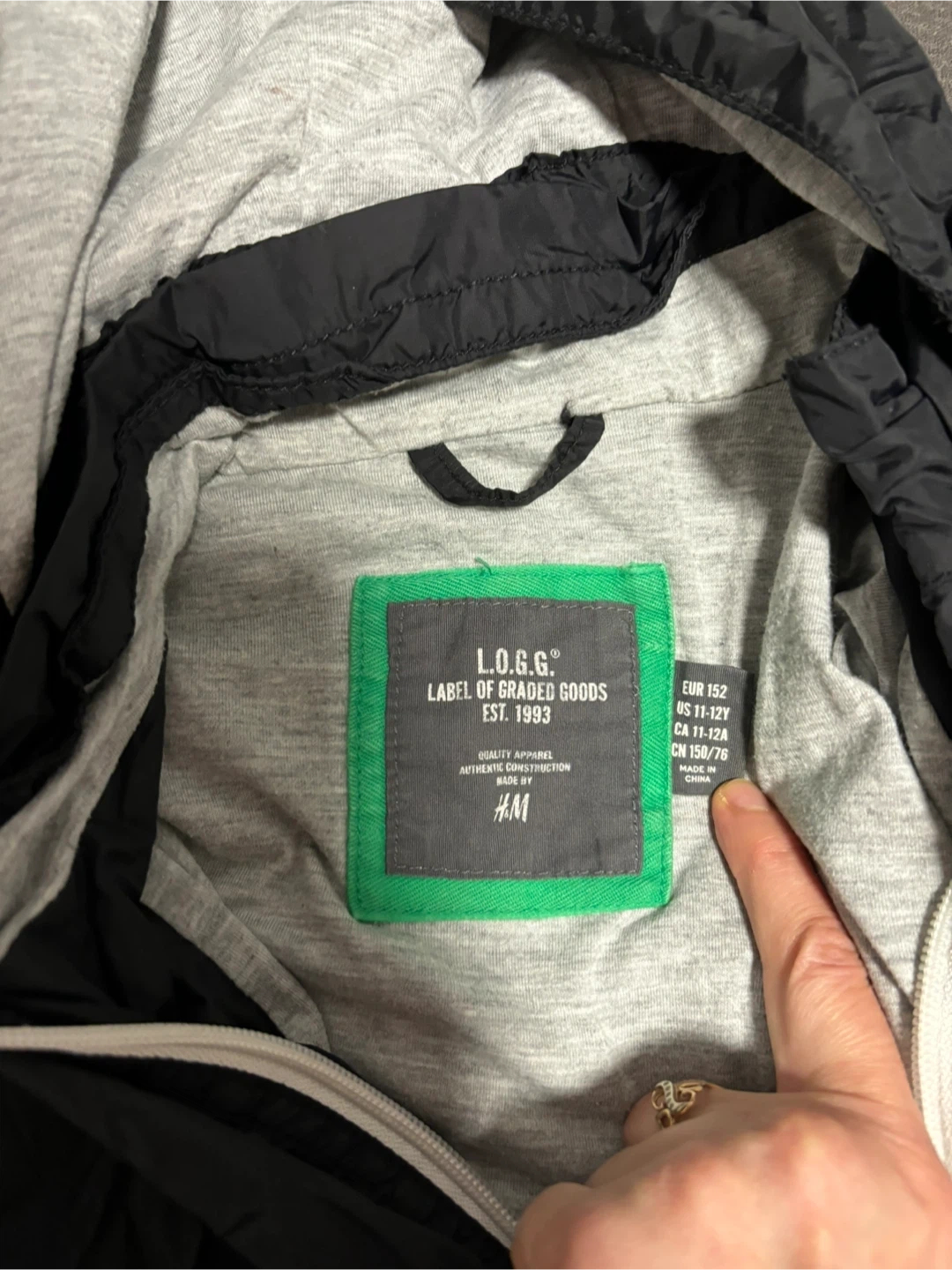 - A black L.O.G.G jacket (size EUR 152, US 11-12Y, CA 11-12A, CN 150/76)