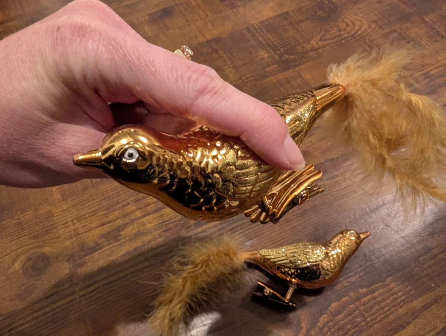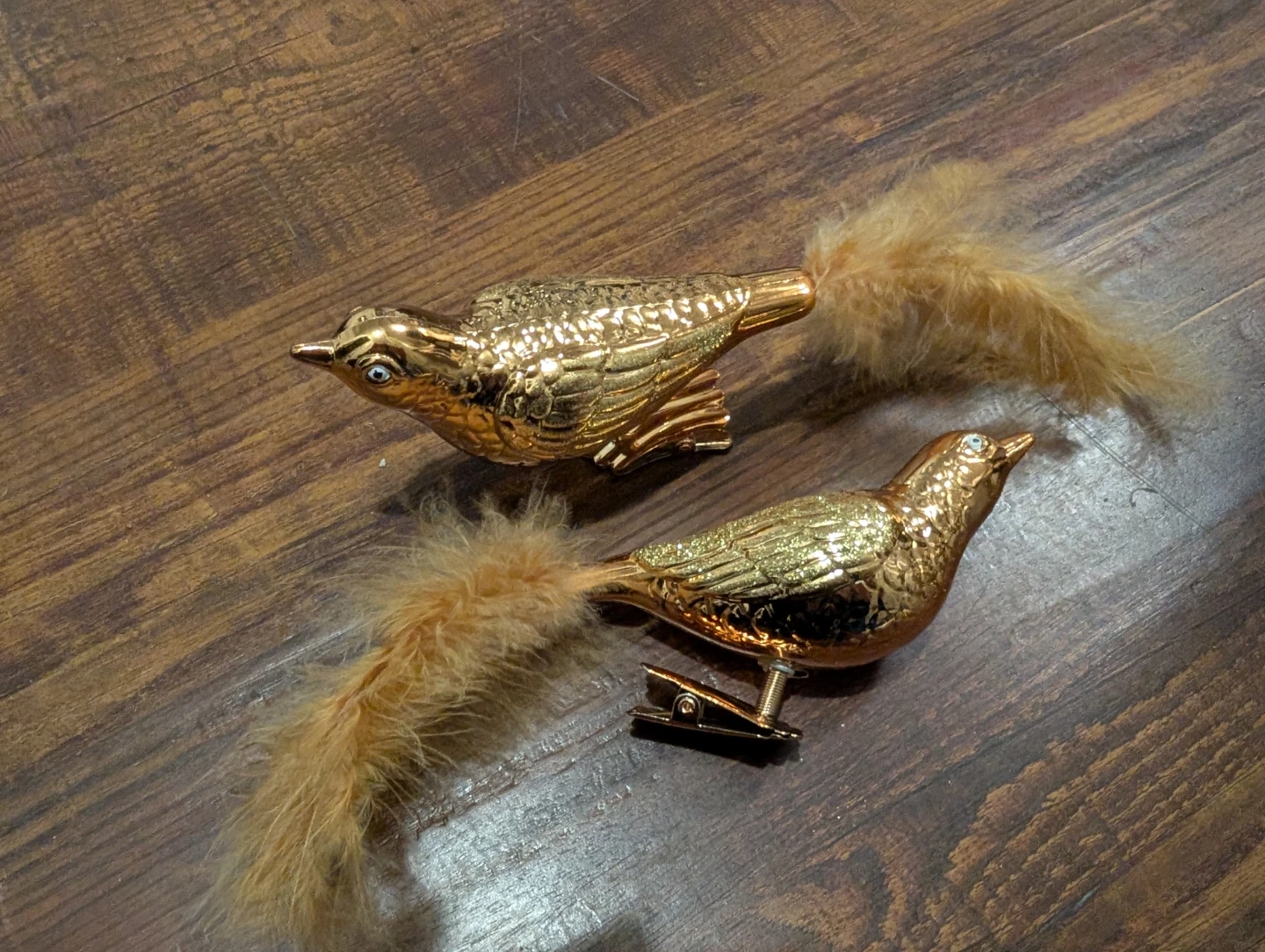 Gold Bird Clip-On Ornaments with Feather Tails (Set of 2)