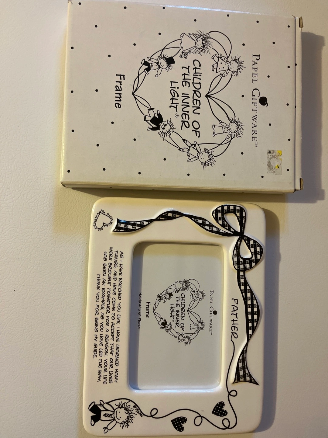 Selling a lovely Papel Giftware frame from the "Children of the Inner Light" series! It's designed to hold a 4" x 6" photo and comes with its original box. The frame features a sweet design with a "Father" theme. It would be a great addition to any home! CASH only please.