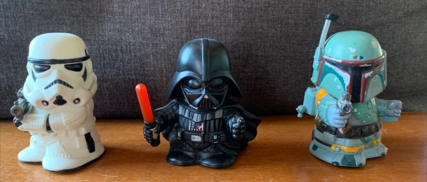 Selling a set of Star Wars wind-up figures by Tomy! Includes a Stormtrooper, Darth Vader, and Boba Fett. They're in great shape and still work. When you put your finger over the two silver contacts on the bottom the figure will say a phrase from the movies.