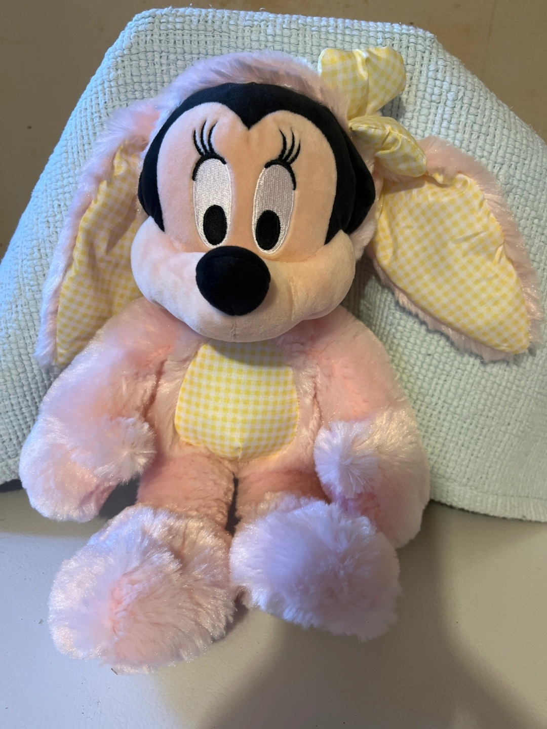 Here's a super cute Minnie Mouse plush dressed as a bunny! It's pink with yellow and white checkered accents. Perfect for Easter or any Disney fan! $10 CASH Only please
