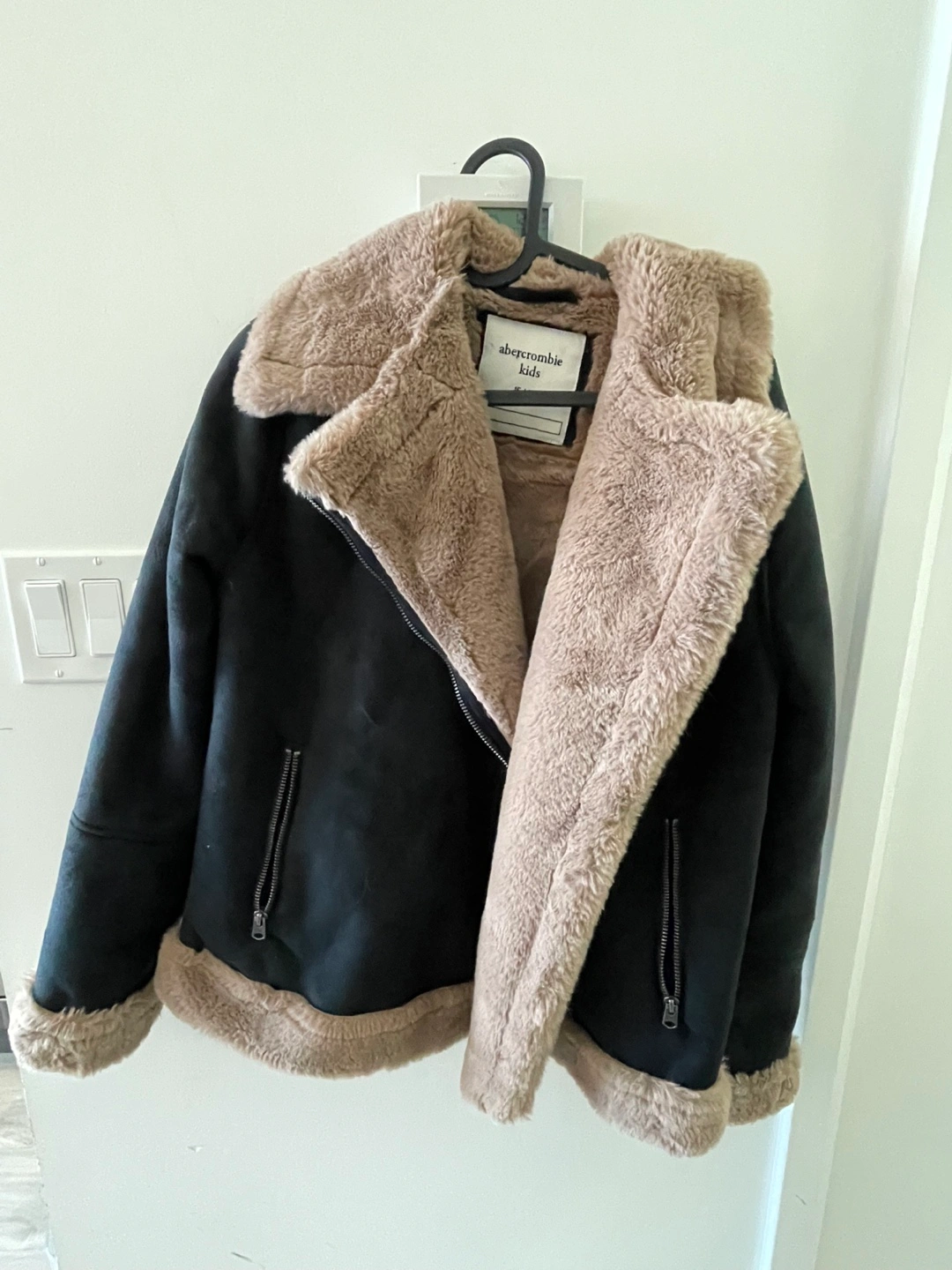Selling an Abercrombie Kids jacket in size 15/16. It's in great condition and ready for a new home! The jacket features a stylish design with a cozy, faux-fur lining. Perfect for keeping warm during cooler weather!