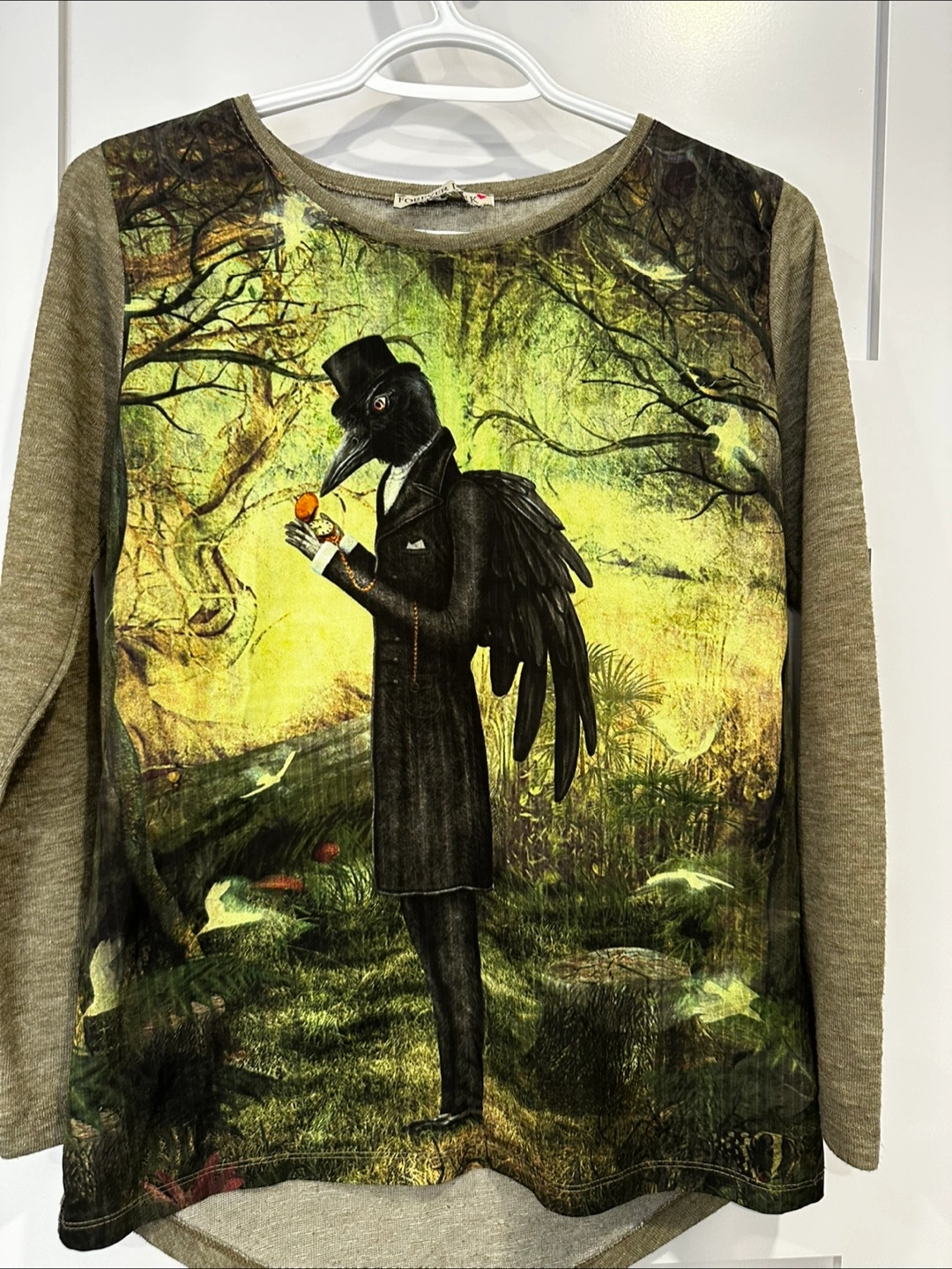 This Foresta by Francesca T-shirt features a unique crow print. The shirt has long sleeves and a round neck. It's in great condition and ready for a new home!