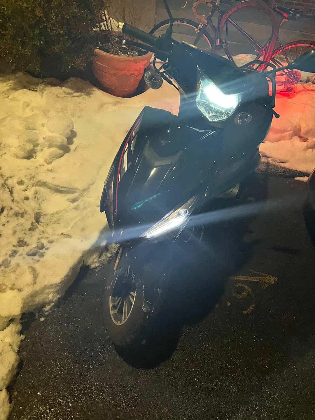 This is a black flying moped 150 It has bright headlights and a sleek design. Tires appear to be in good condition brand new have a video for you to see if want more information about it I would be 500 for it that’s the least