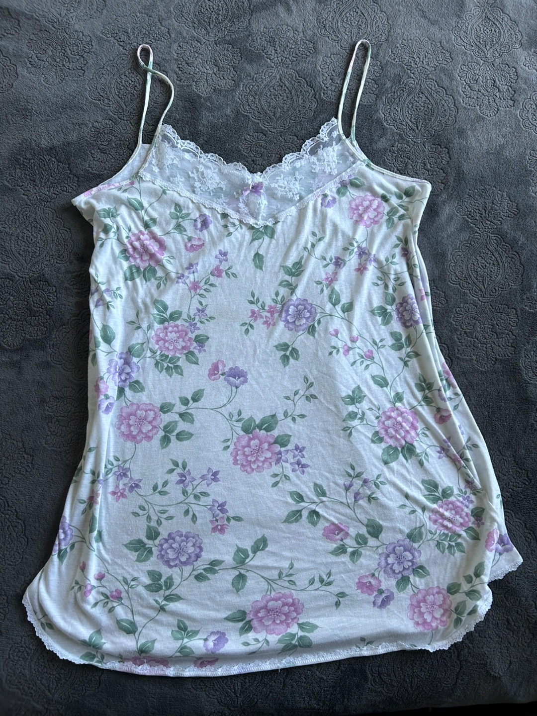 Free cute cami top featuring a floral print with purple and green hues, and delicate lace trim along the neckline.