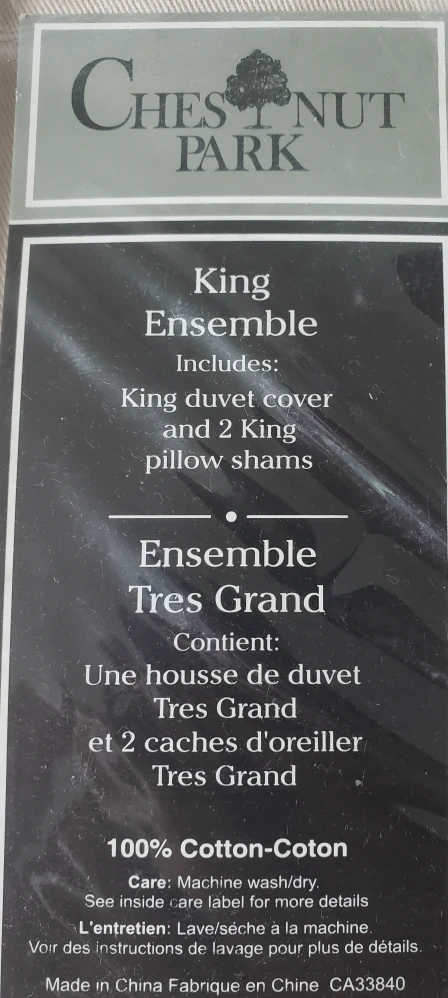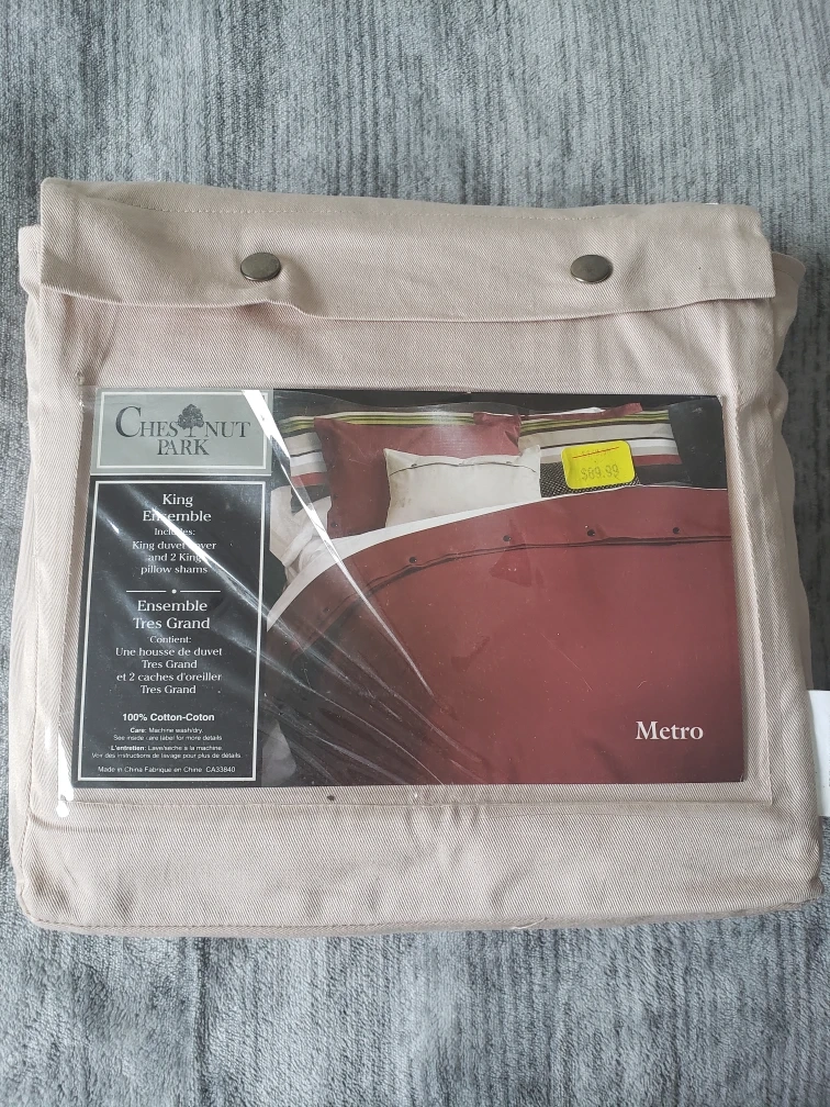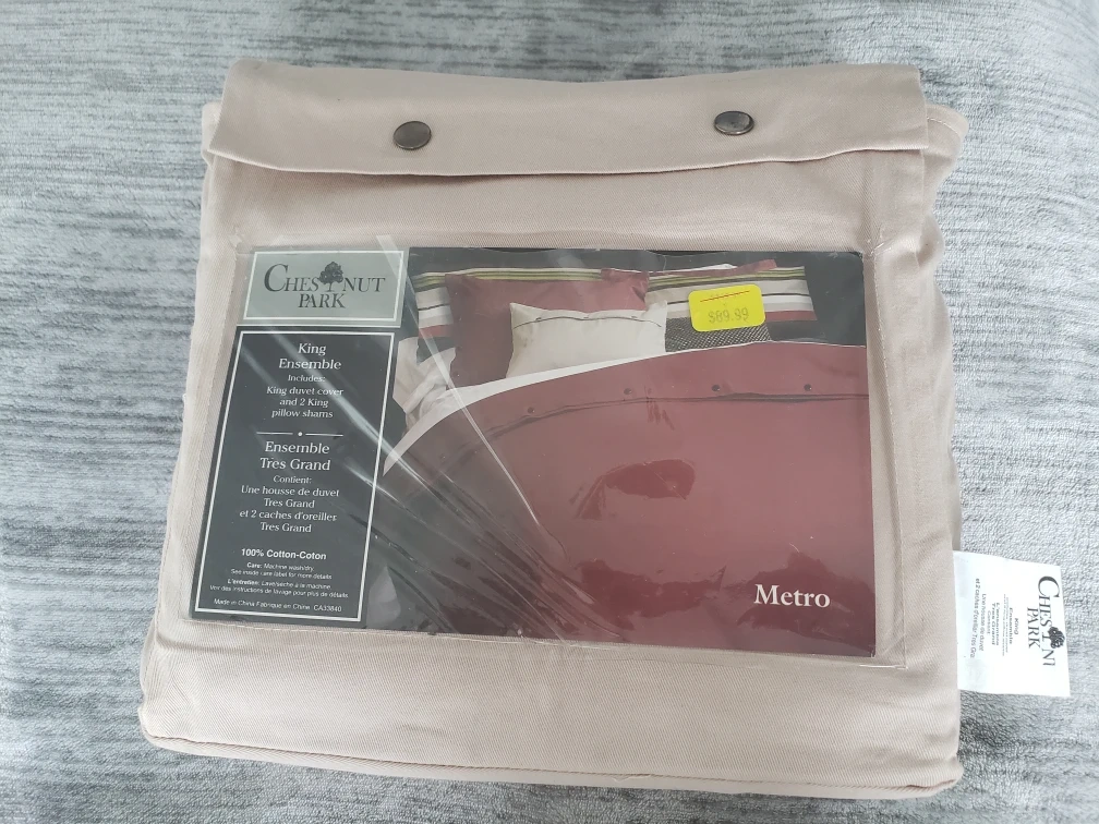 Selling a brand new Chestnut Park King Ensemble. It includes the king duvet cover and two king pillow shams. It's made of 100% cotton and is machine washable. Originally bought for $89.99, it comes in the original packaging