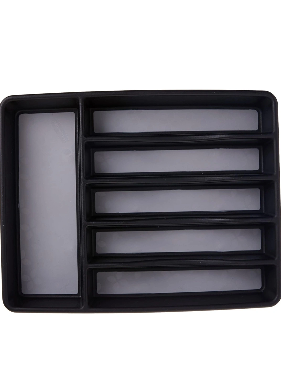 Keep your cutlery neatly organized with this black cutlery tray! It measures 15" x 11.75" x 1.75". It's in great shape and ready to help declutter your kitchen drawers