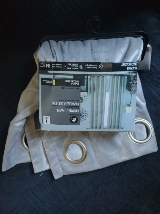Selling a hometrends velvet blackout grommet panel. It's a single panel, sized 50 in x 84 in (127 cm x 213 cm). This panel helps to reduce drafts and noise, and is energy saving. Perfect for keeping the light out!