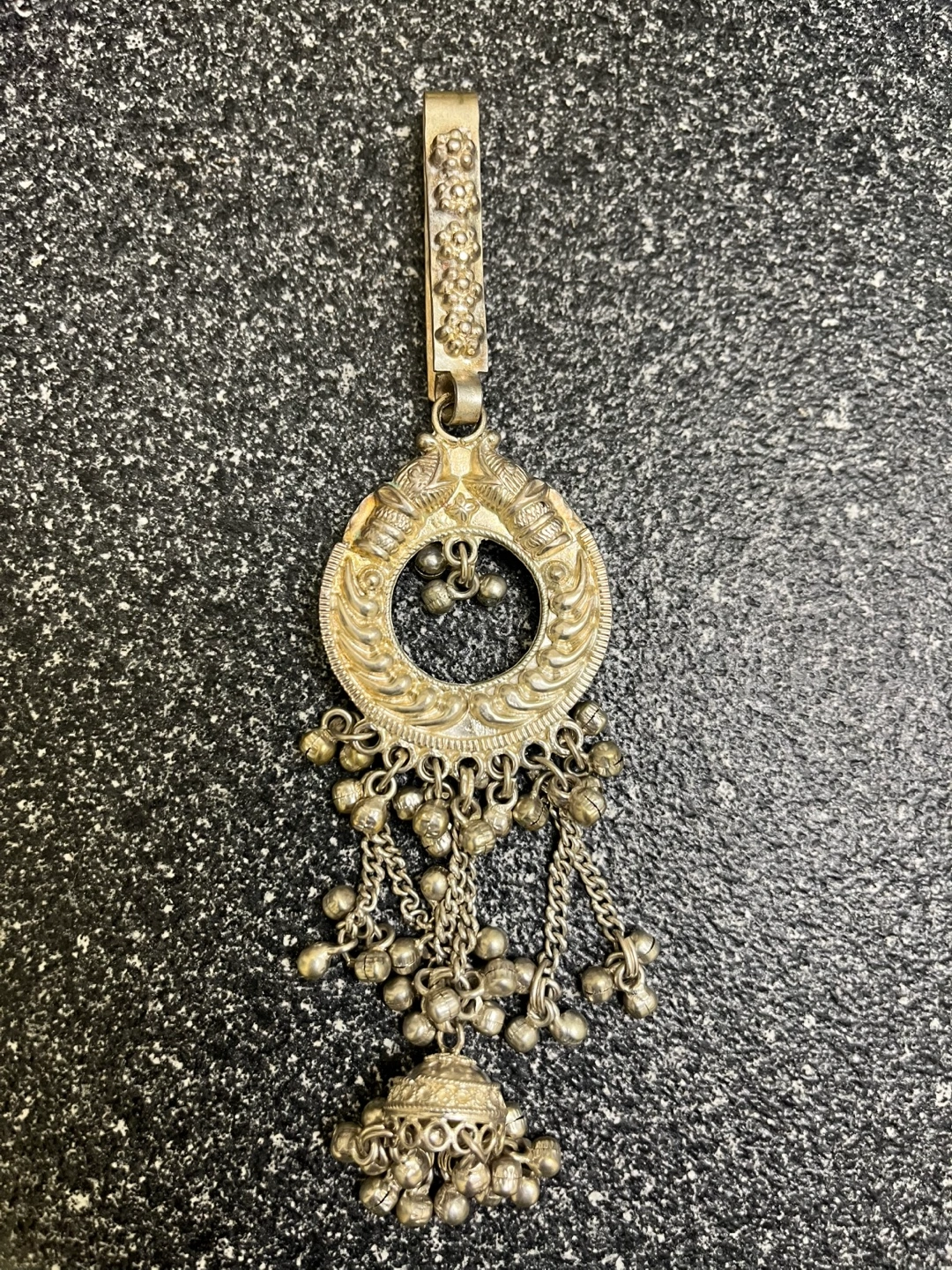 Selling a silver-toned metal belt clip with a unique tassel design. It's in great condition and would add a nice touch to any outfit!