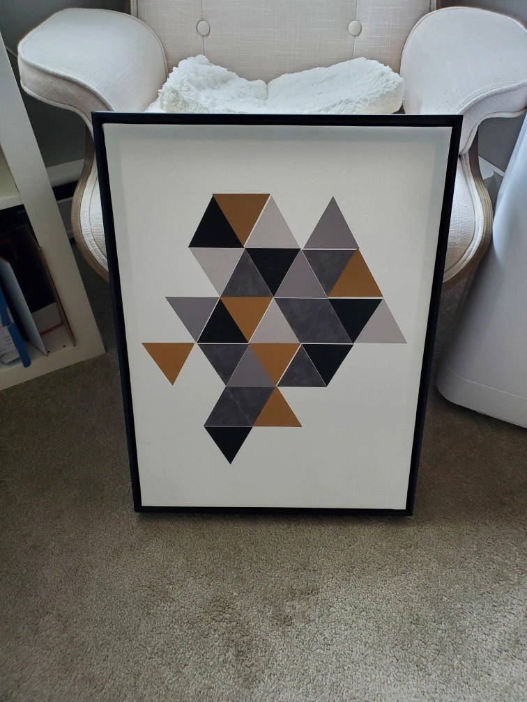 Here's a framed piece of wall art featuring a geometric triangle design. It has a modern look with black, grey, and brown triangles on a white background. The frame is black and in good condition, ready to hang in your home!