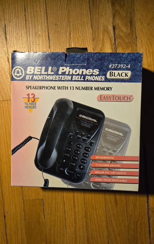Selling a BELL Phones speakerphone in black! It features 13 number memory and an EasyTouch design. The box includes the speakerphone, and it has a ringer on/off switch and is tone/pulse switchable