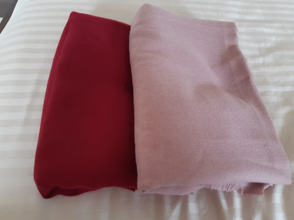 Pashmina scarfs woven in raspberry red and blush pink. no pulls in pristine condition, well kept wrapped in a bag. I bought many in various colors from india because of the quality, they are wide,thick and bulky. Selling 2 just due to downsizing. pick up from bramlea city centre or airport and sandalwood or drop off options are available depending on the location