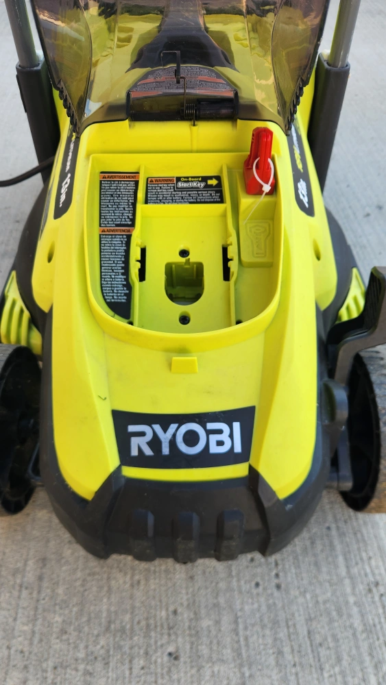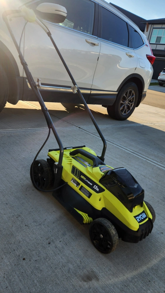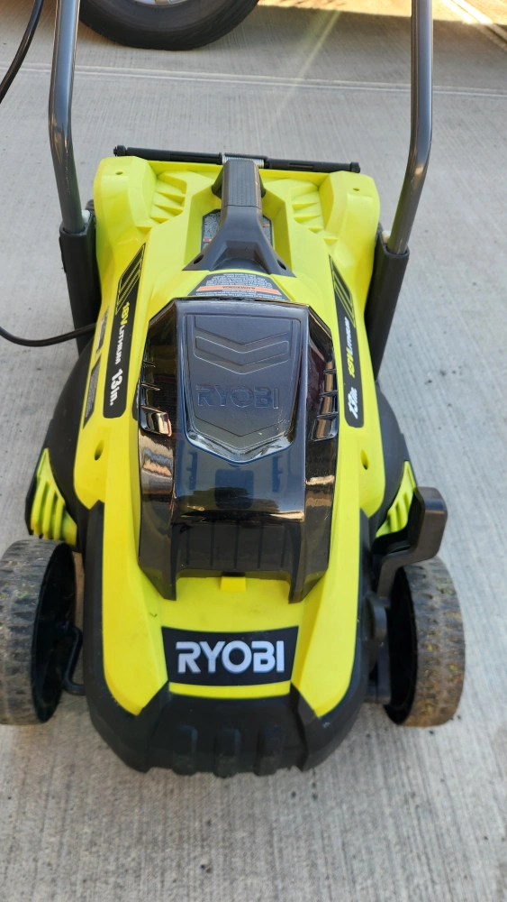 Selling a Ryobi 18V Lithium lawn mower with a 13-inch cutting deck.