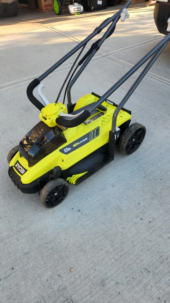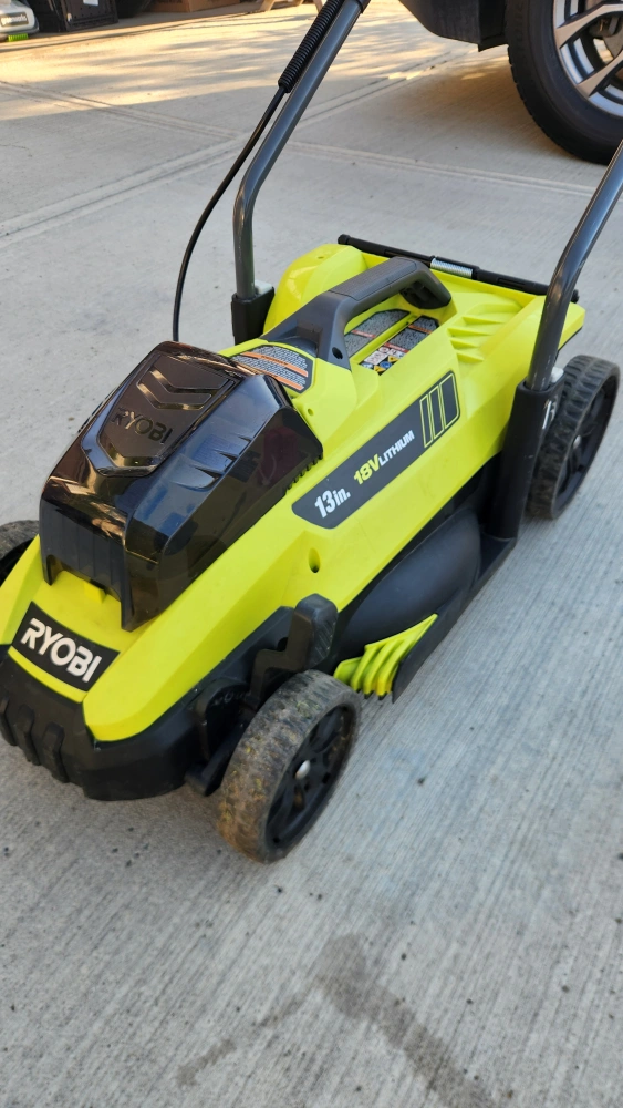 Selling a Ryobi 18V Lithium lawn mower with a 13-inch cutting deck.