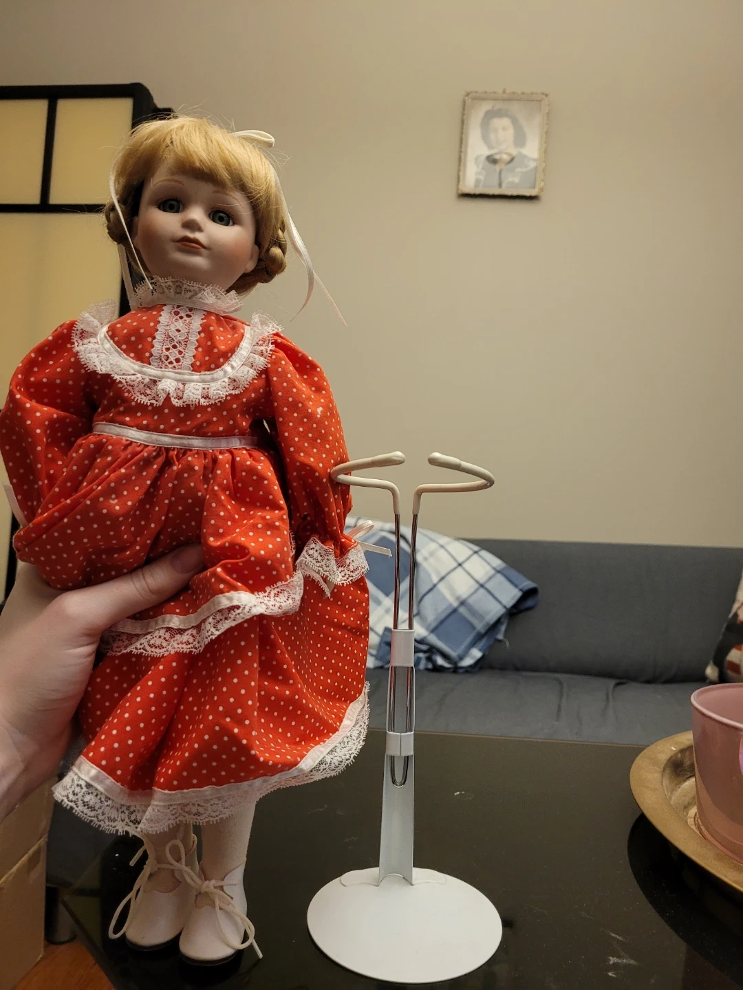 A beautiful porcelain doll dressed in a charming red polka dot dress with white lace trim. The doll has blonde hair styled in braids and comes with a stand for display. It's in great condition and would make a lovely addition to any collection or a sweet gift for a doll enthusiast. Lightly dusty from being in storage.