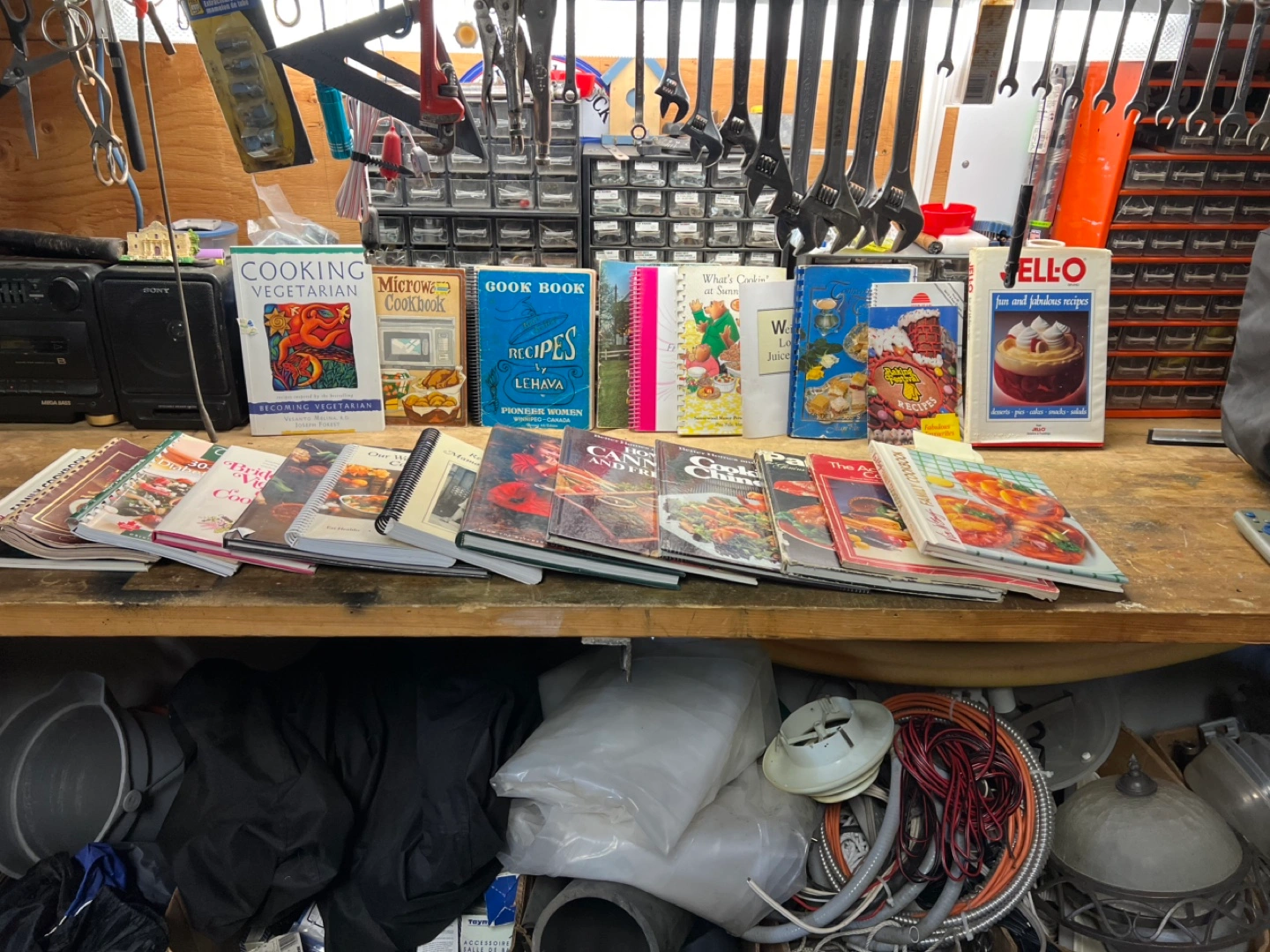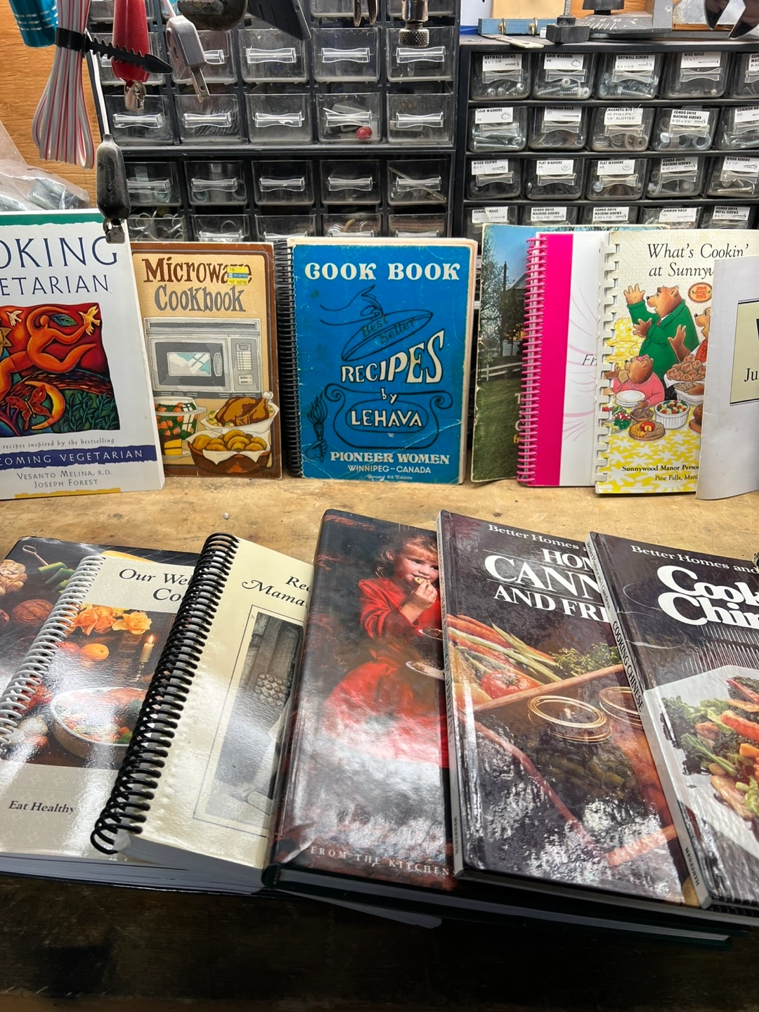 Lot of various cookbooks. Many spiral bound. Titles include Becoming Vegetarian, Microwave Cookbook, Pioneer Women recipes, Better Homes and Gardens, Jell-O recipes, and more. Some show wear.