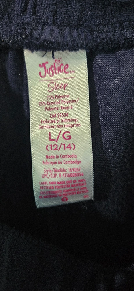 Justice Sleep set in size Large (12/14). The pants are made of 75% Polyester and 25% Recycled Polyester. The top has 'low key justice' printed on it with the Justice logo printed on the sleeves