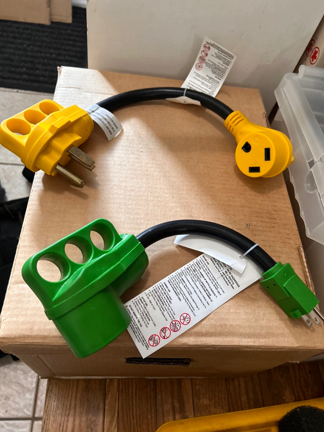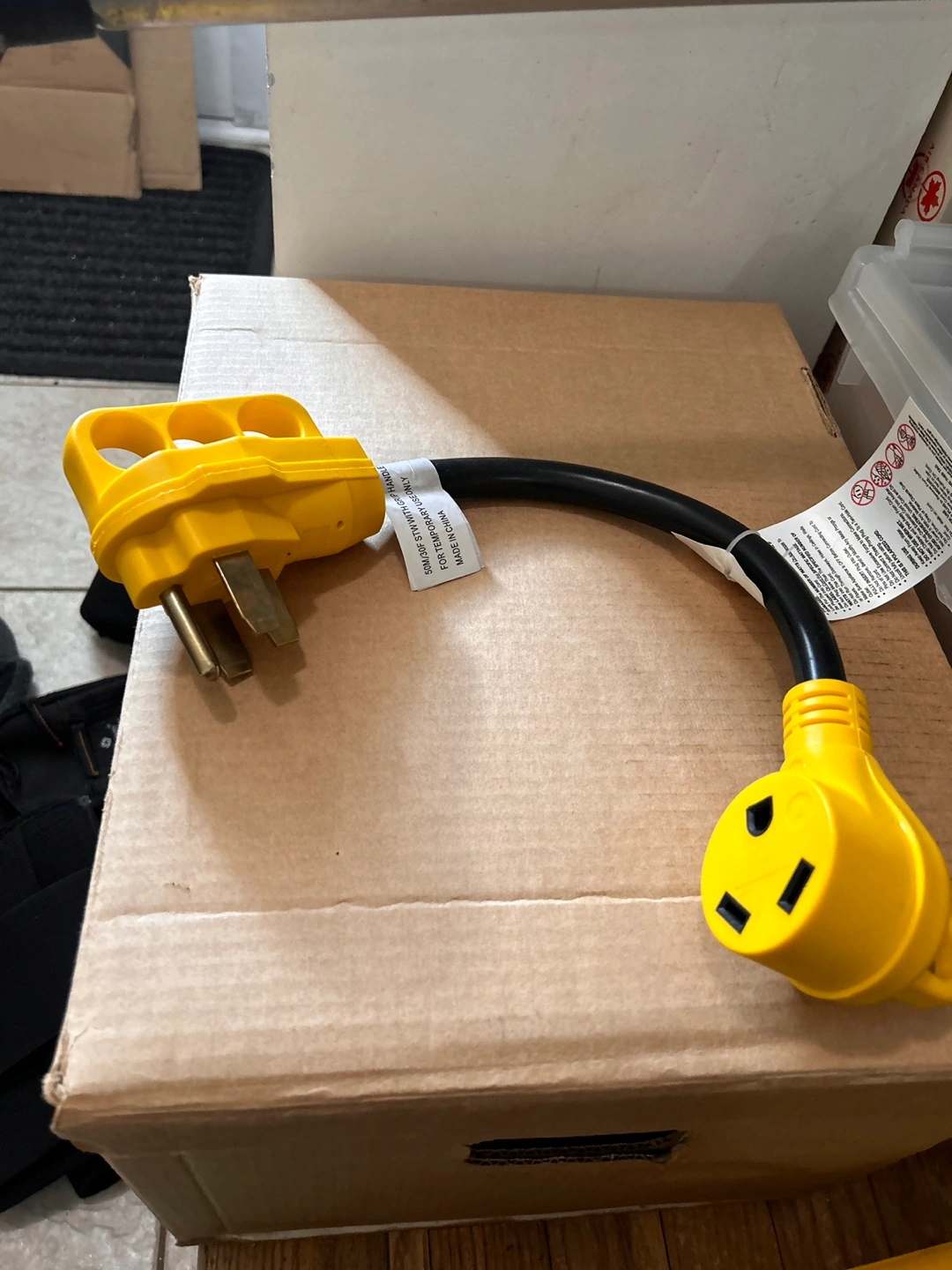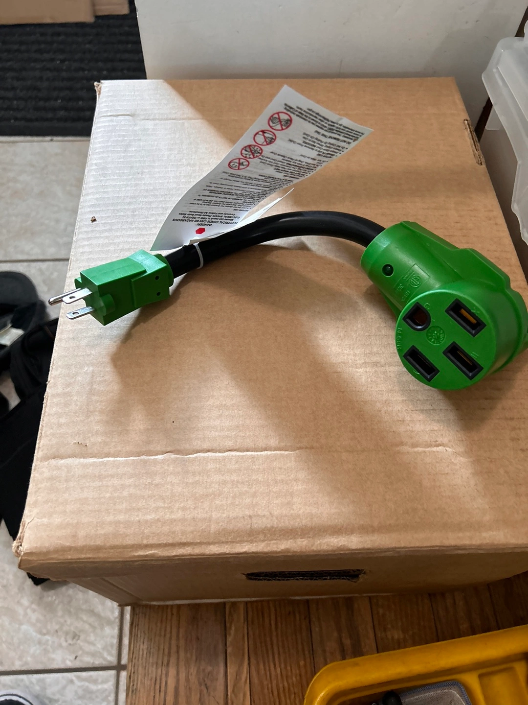 Selling an RV 30 amp to 50 amp adapter. It's in great shape and ready to use for your next camping trip! Comes with the original box.