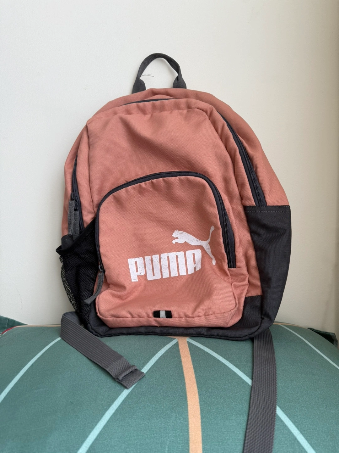 Puma branded backpack in a stylish terracotta and grey color combination. Lightweight and spacious design with padded shoulder straps and inner laptop sleeve. Comes with front zipper pocket and side mesh pouch (note: mesh shows some wear, see last photo). Zippers work perfectly. Ideal for school, casual use, or as a travel daypack.