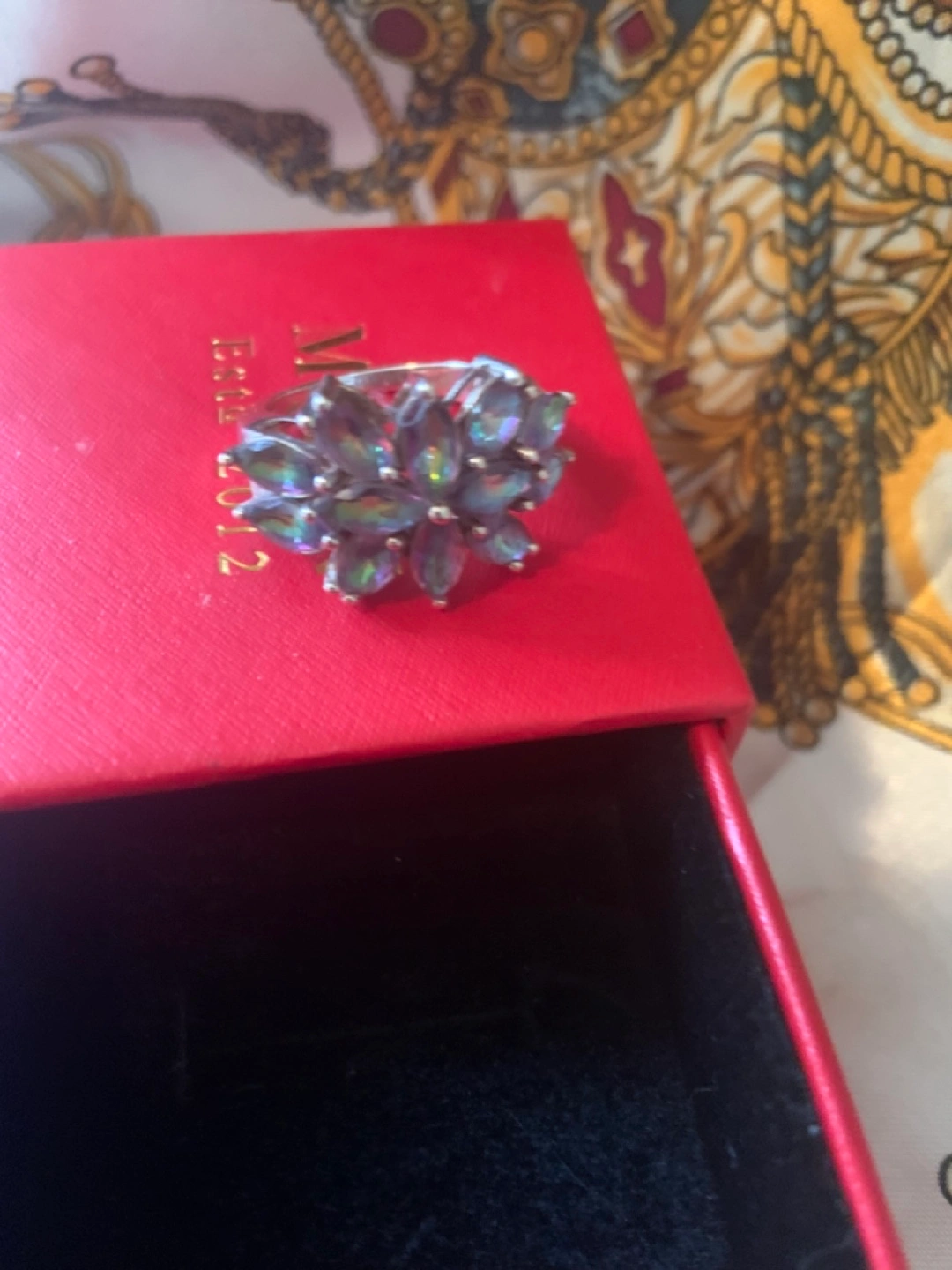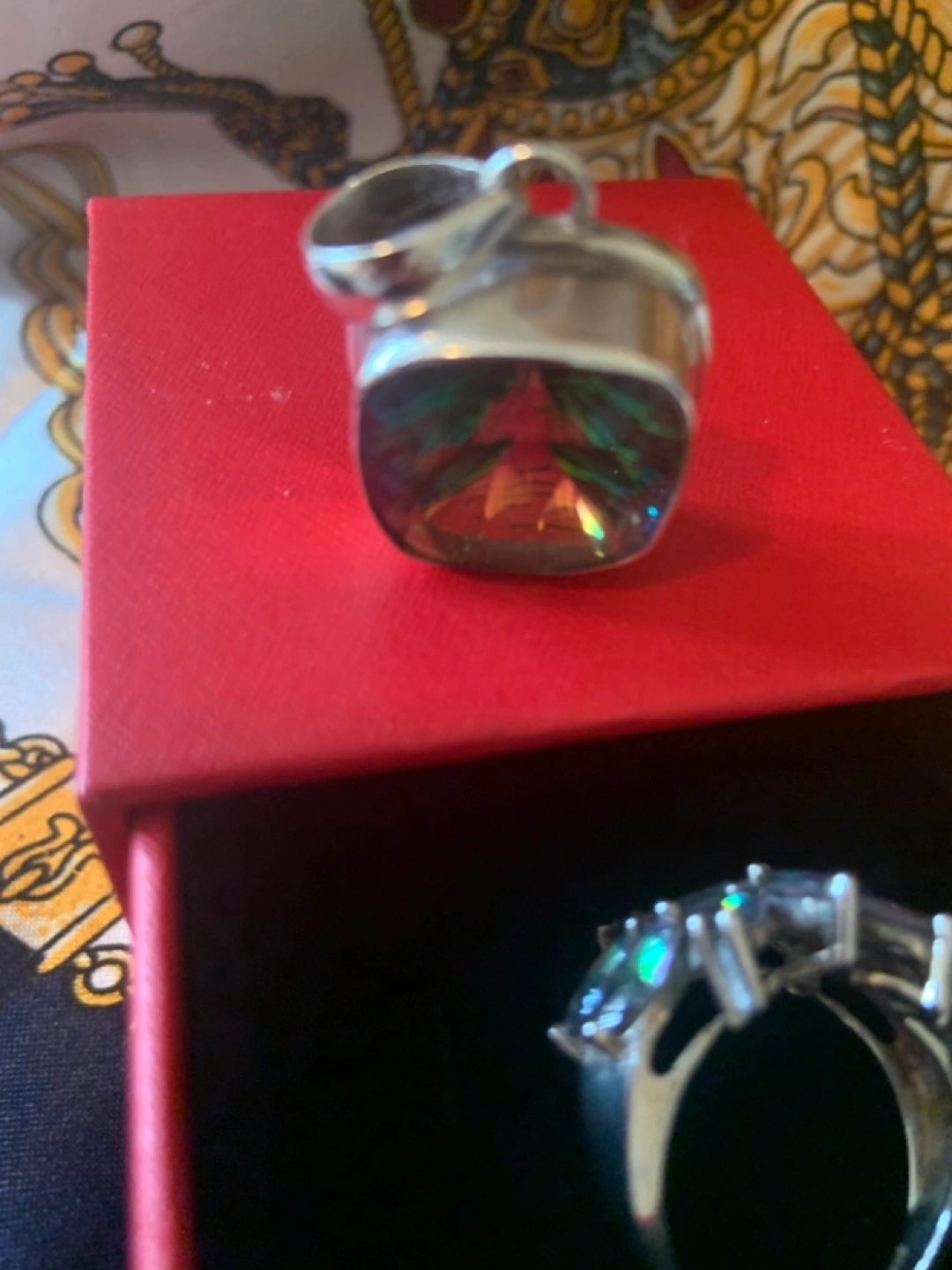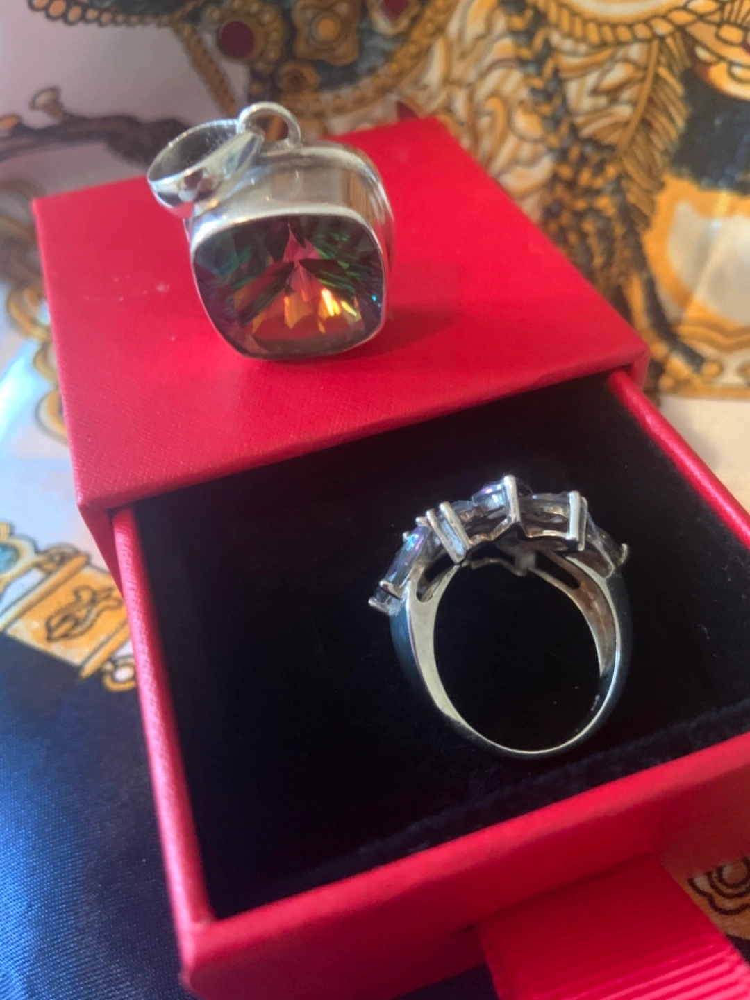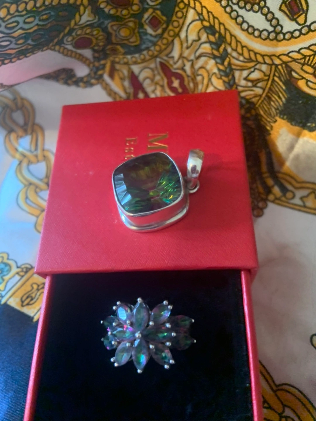 73Selling a beautiful mystic topaz pendant and ring set. The stones have a lovely iridescent sheen. Solid sterling silver.Comes in the original box!