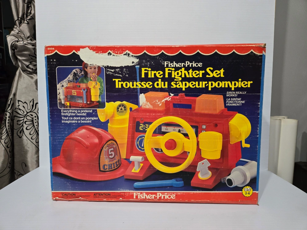 Selling a vtg Fisher-Price Fire Fighter Set! It's a fun toy for kids who love pretending to be firefighters. Comes with the original box