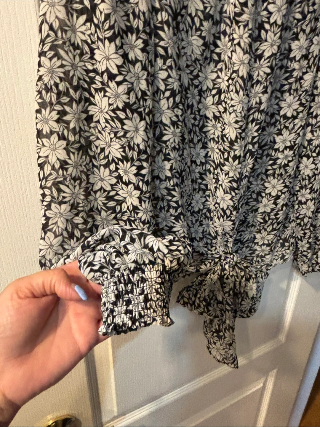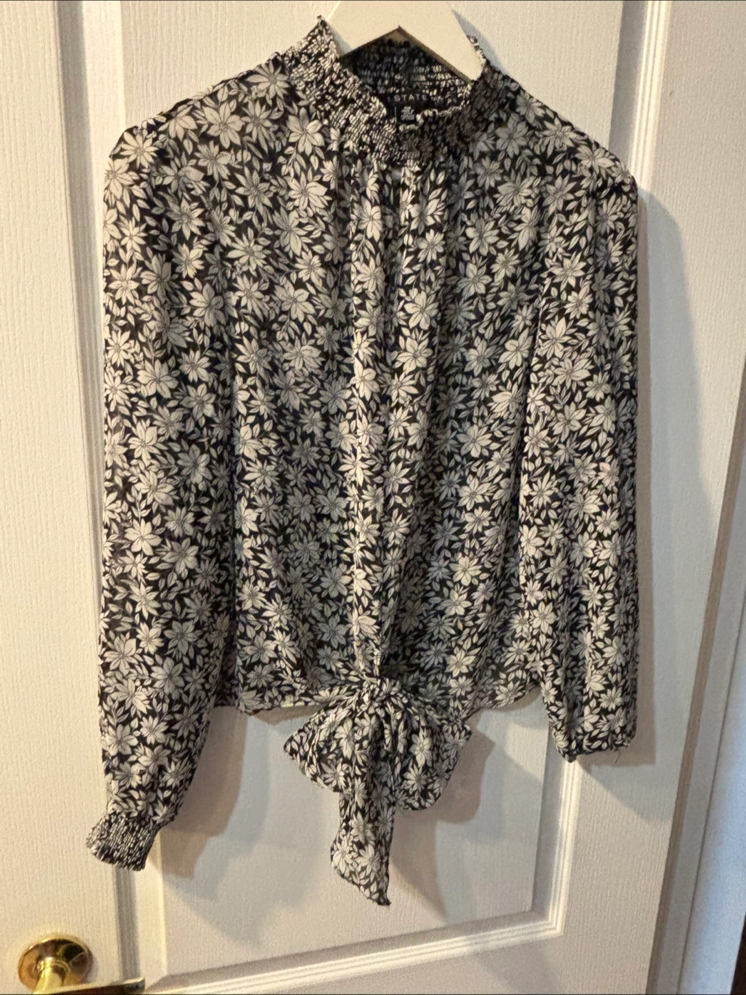 Cute 1.STATE blouse with a black and white floral print! It features a tie-front detail and a smocked high neckline. Size M/M. CASH ONLY