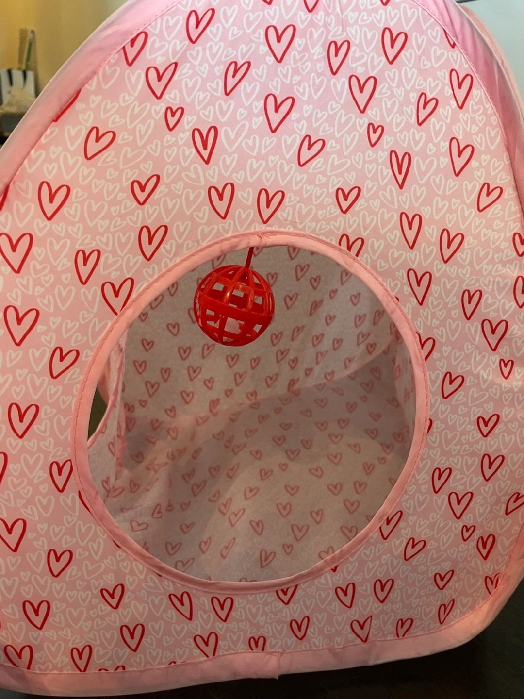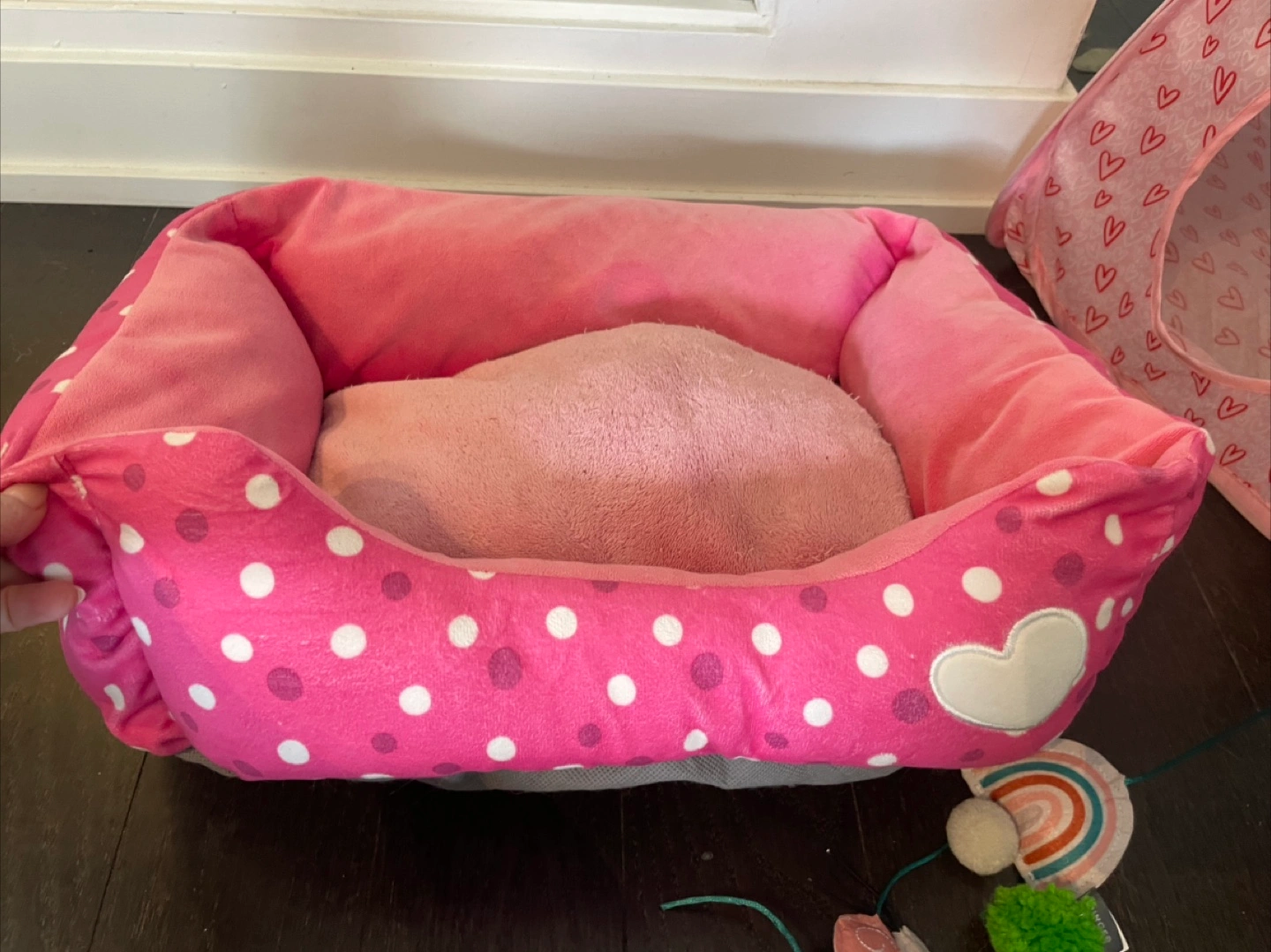 300Selling a bundle of cat items! Included is a comfy pink polka dot cat bed, a cute heart-patterned foldable cat tent, a grey cat toy storage basket, and a variety of fun cat toys. Perfect for your feline friend!