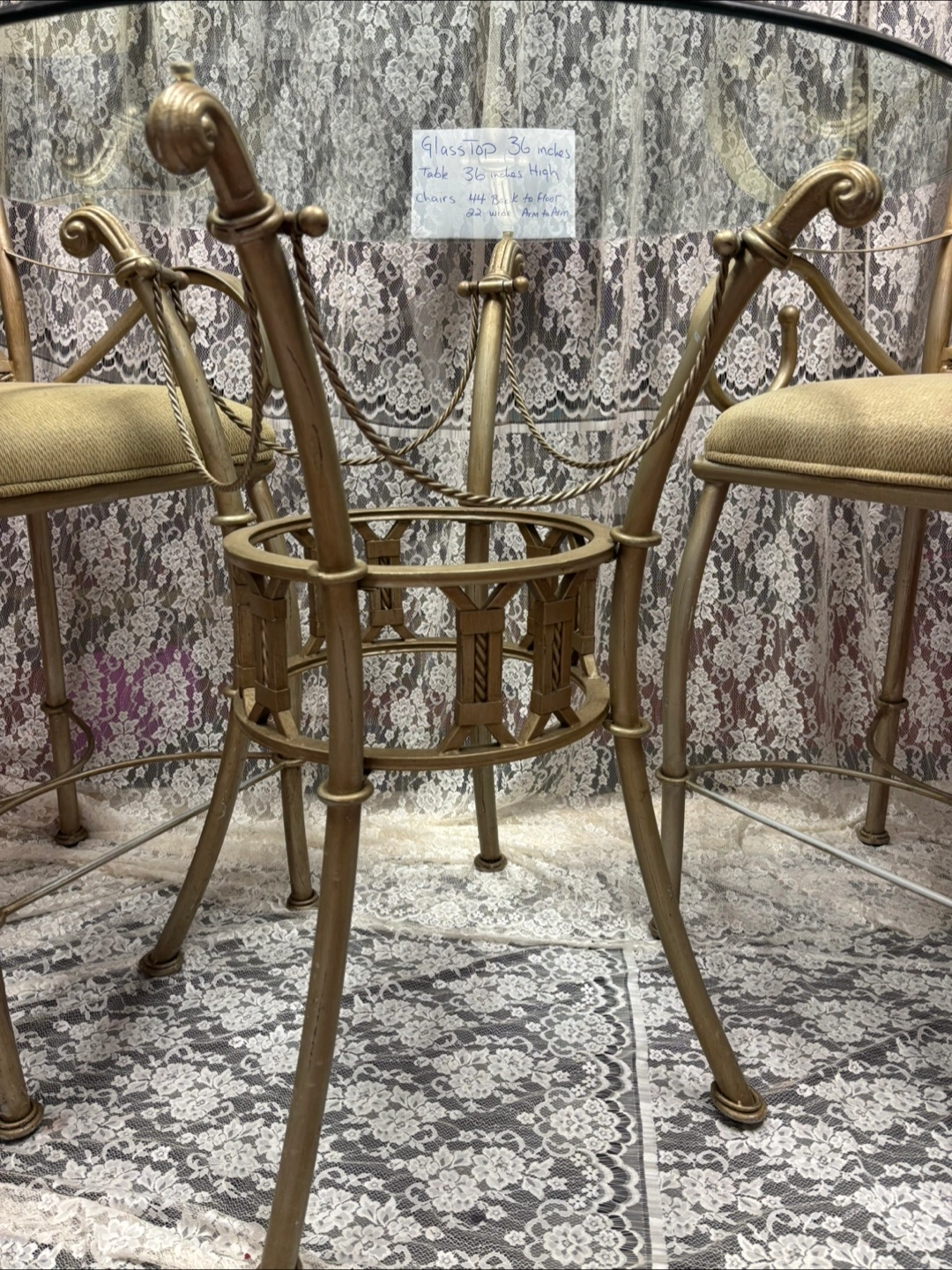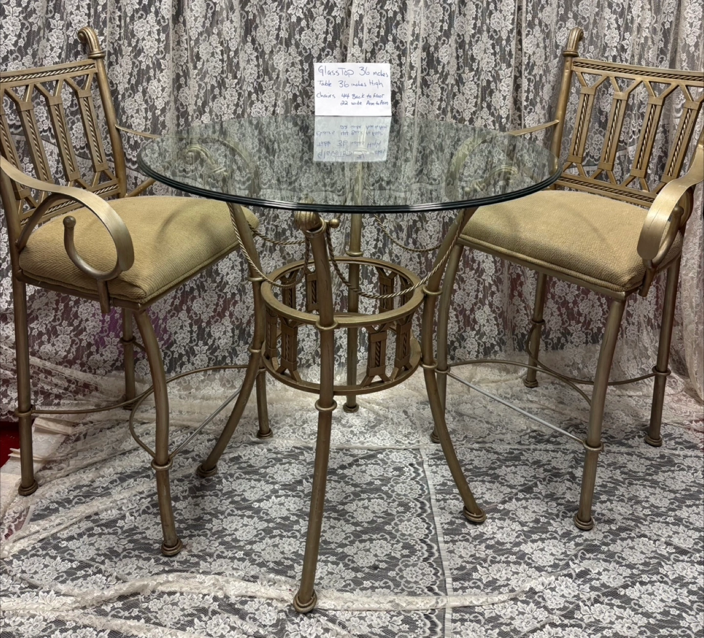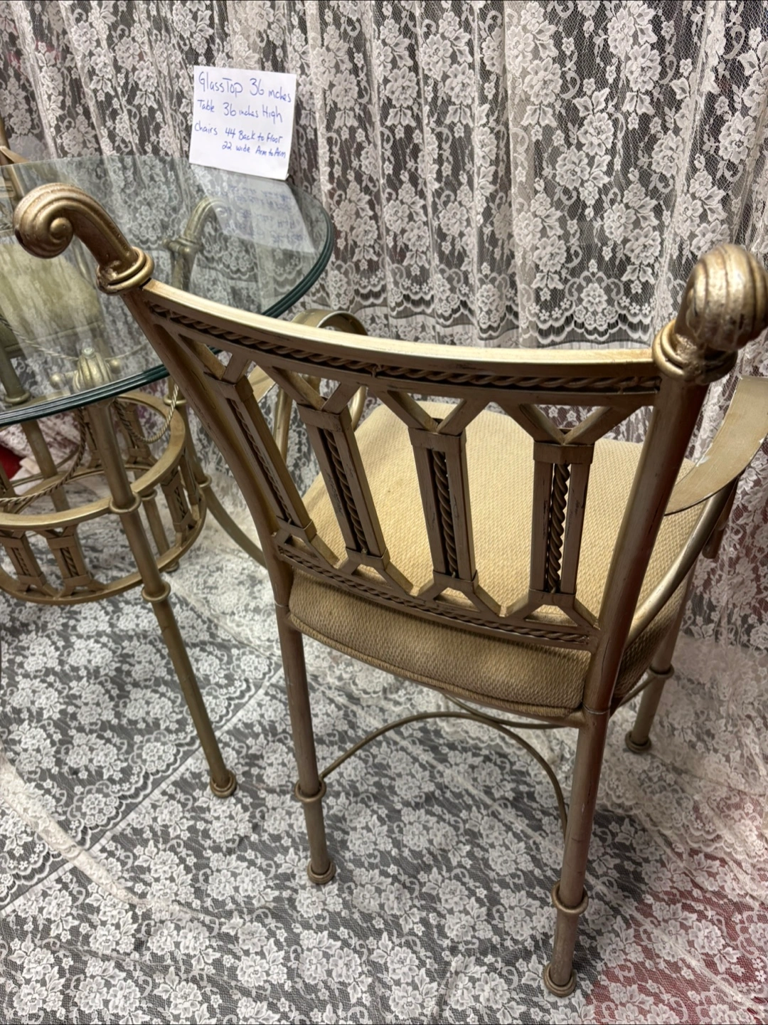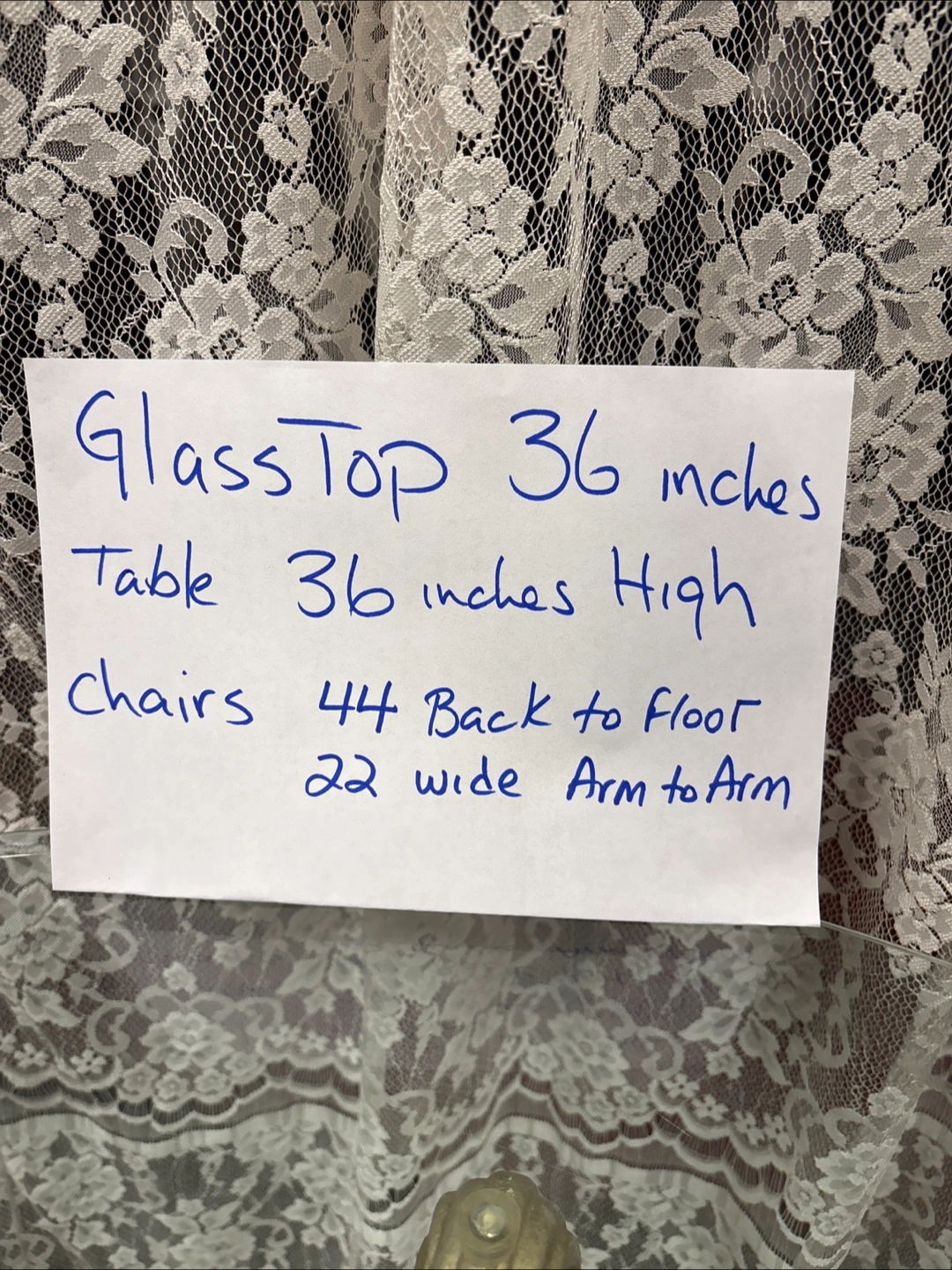 91Selling a glass top table with two chairs. The tabletop is 36 inches in diameter and the table is 36 inches high. The chairs measure 44 inches from back to floor and are 22 inches wide from arm to arm Metal base