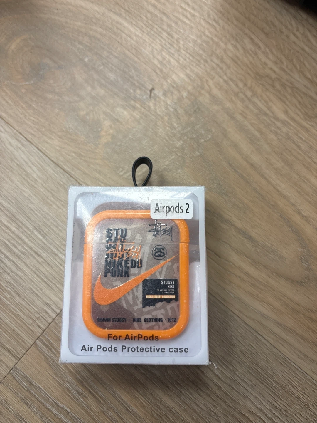 This is a Stüssy x Nike collaboration protective case for Airpods 2. It features a clear orange design with Stüssy and Nike branding. Includes original packaging.